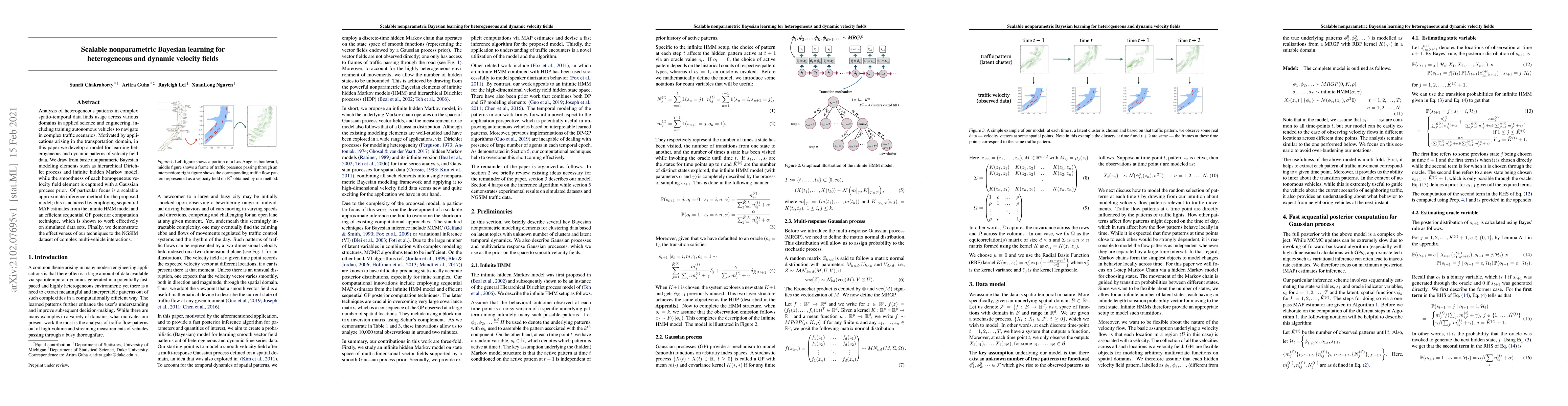 This paper proposes a scalable nonparametric Bayesian model for learning dynamic and heterogeneous velocity fields, combining hierarchical Dirichlet processes and infinite hidden Markov models with Gaussian process priors. It introduces an efficient sequential inference method and demonstrates its effectiveness on the NGSIM dataset for multi-vehicle interactions.