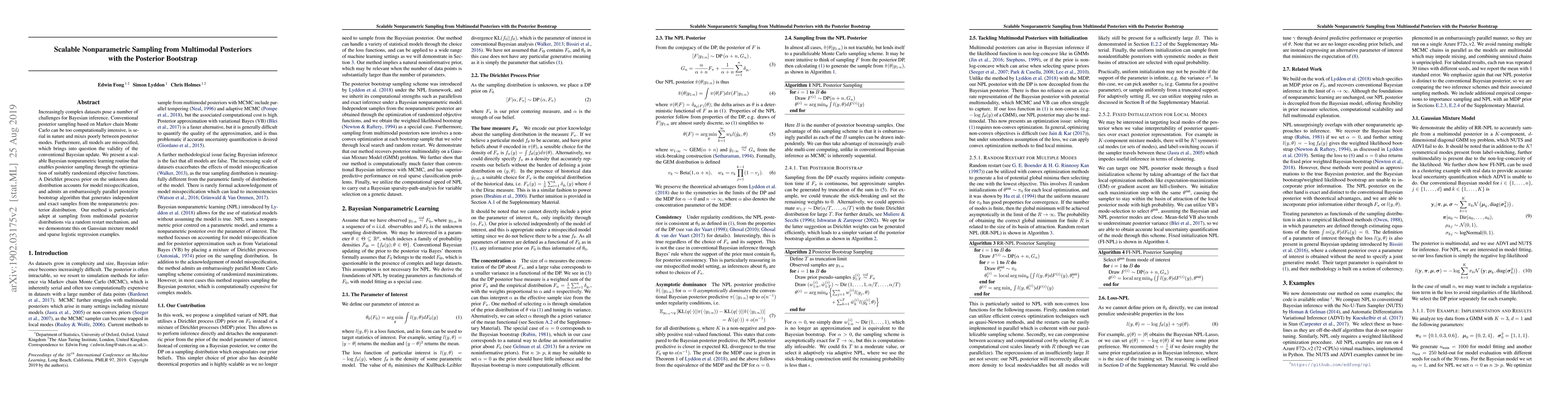 This paper introduces a scalable nonparametric sampling method for multimodal posteriors using a posterior bootstrap, addressing the computational limitations of traditional Markov chain Monte Carlo. The method leverages a Dirichlet process prior to handle model misspecification and employs an embarrassingly parallel algorithm for efficient sampling.