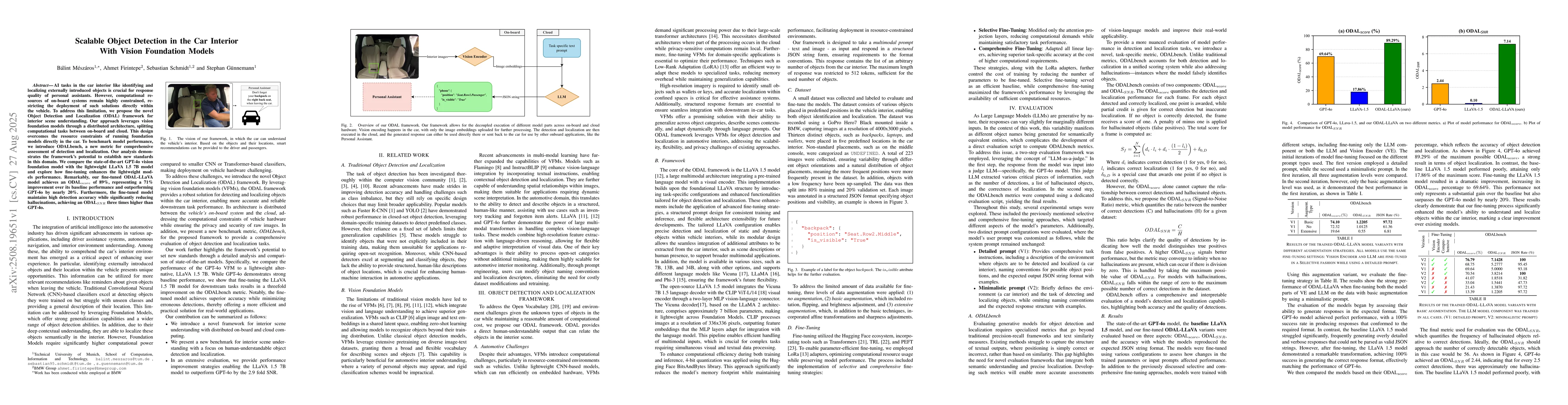 AI tasks in the car interior like identifying and localizing externally introduced objects is crucial for response quality of personal assistants. However, computational resources of on-board systems remain highly constrained, restricting the deployment of such solutions directly within the vehicle. To address this limitation, we propose the novel Object Detection and Localization (ODAL) framework for interior scene understanding. Our approach leverages vision foundation models through a distributed architecture, splitting computational tasks between on-board and cloud. This design overcomes the resource constraints of running foundation models directly in the car. To benchmark model performance, we introduce ODALbench, a new metric for comprehensive assessment of detection and localization.Our analysis demonstrates the framework's potential to establish new standards in this domain. We compare the state-of-the-art GPT-4o vision foundation model with the lightweight LLaVA 1.5 7B model and explore how fine-tuning enhances the lightweight models performance. Remarkably, our fine-tuned ODAL-LLaVA model achieves an ODAL$_{score}$ of 89%, representing a 71% improvement over its baseline performance and outperforming GPT-4o by nearly 20%. Furthermore, the fine-tuned model maintains high detection accuracy while significantly reducing hallucinations, achieving an ODAL$_{SNR}$ three times higher than GPT-4o.