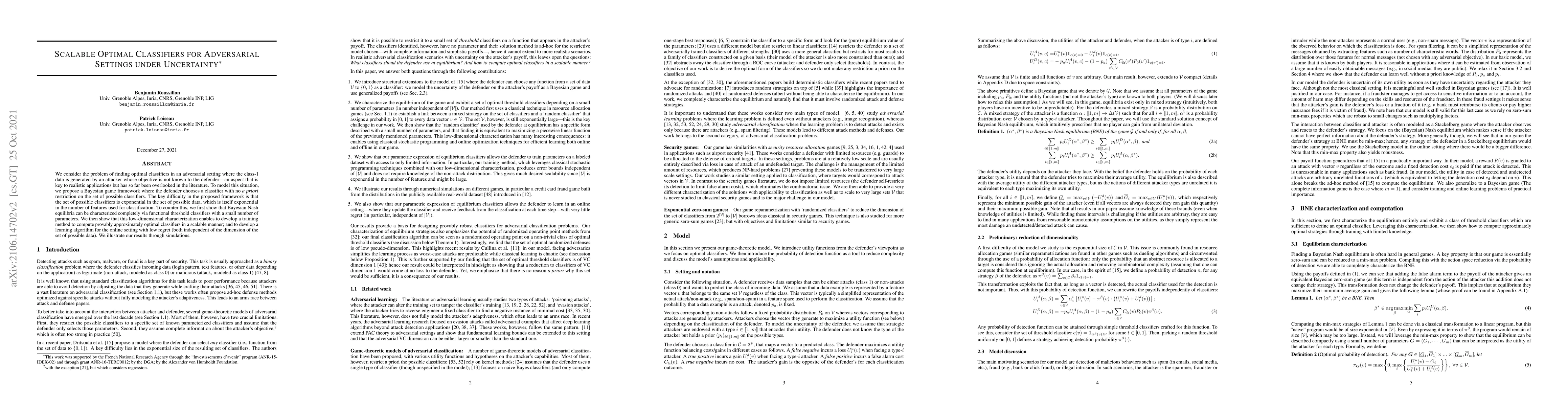 We consider the problem of finding optimal classifiers in an adversarial setting where the class-1 data is generated by an attacker whose objective is not known to the defender -- an aspect that is key to realistic applications but has so far been overlooked in the literature. To model this situation, we propose a Bayesian game framework where the defender chooses a classifier with no a priori restriction on the set of possible classifiers. The key difficulty in the proposed framework is that the set of possible classifiers is exponential in the set of possible data, which is itself exponential in the number of features used for classification. To counter this, we first show that Bayesian Nash equilibria can be characterized completely via functional threshold classifiers with a small number of parameters. We then show that this low-dimensional characterization enables to develop a training method to compute provably approximately optimal classifiers in a scalable manner; and to develop a learning algorithm for the online setting with low regret (both independent of the dimension of the set of possible data). We illustrate our results through simulations.