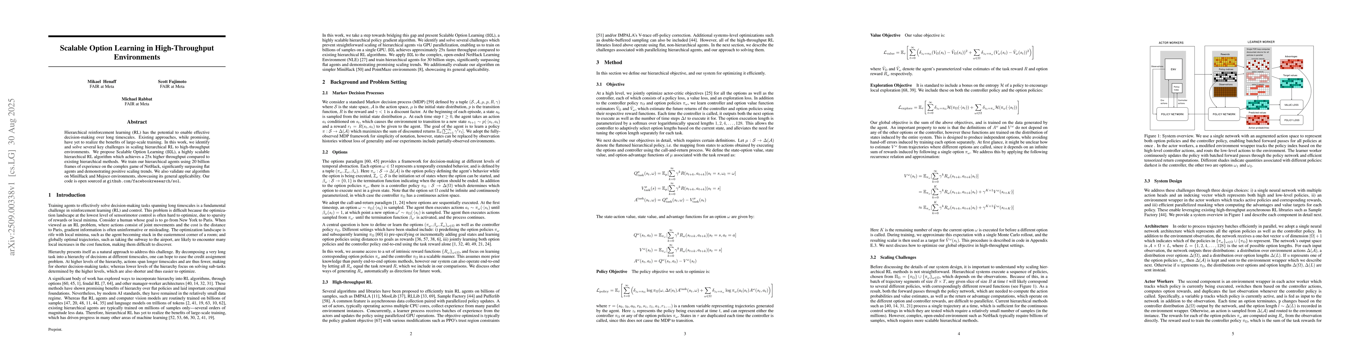 Hierarchical reinforcement learning (RL) has the potential to enable effective decision-making over long timescales. Existing approaches, while promising, have yet to realize the benefits of large-scale training. In this work, we identify and solve several key challenges in scaling hierarchical RL to high-throughput environments. We propose Scalable Option Learning (SOL), a highly scalable hierarchical RL algorithm which achieves a 25x higher throughput compared to existing hierarchical methods. We train our hierarchical agents using 20 billion frames of experience on the complex game of NetHack, significantly surpassing flat agents and demonstrating positive scaling trends. We also validate our algorithm on MiniHack and Mujoco environments, showcasing its general applicability. Our code is open sourced at github.com/facebookresearch/sol.