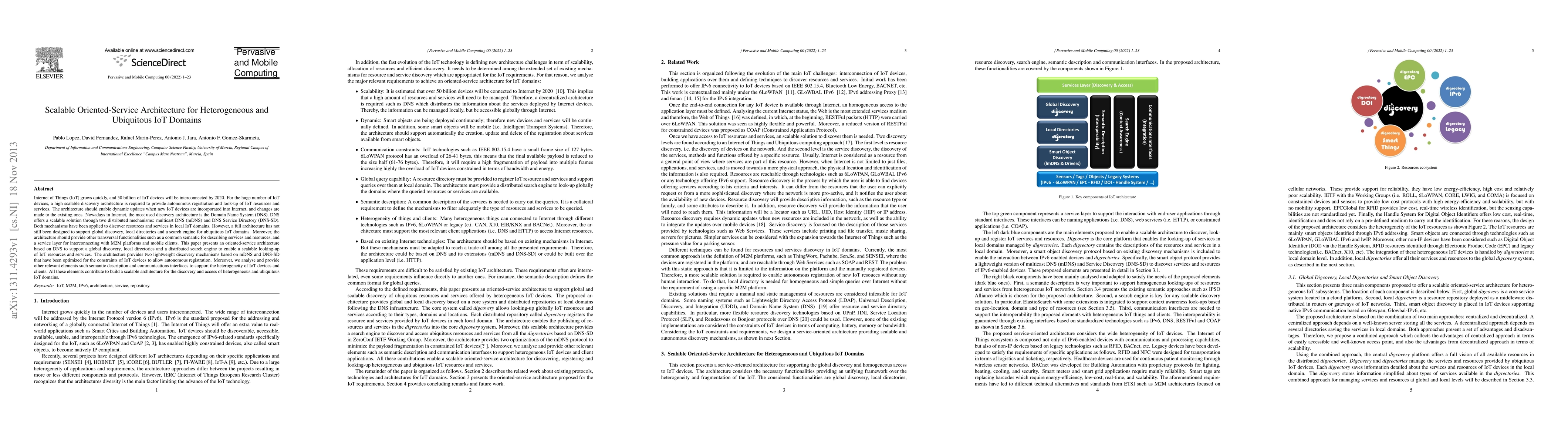 This paper proposes an oriented-service architecture based on DNS to enable scalable discovery and autonomous registration of IoT resources and services across heterogeneous and ubiquitous IoT domains. The architecture incorporates optimized lightweight discovery mechanisms, semantic descriptions, and communication interfaces to support global discovery, local directories, and a distributed search engine.