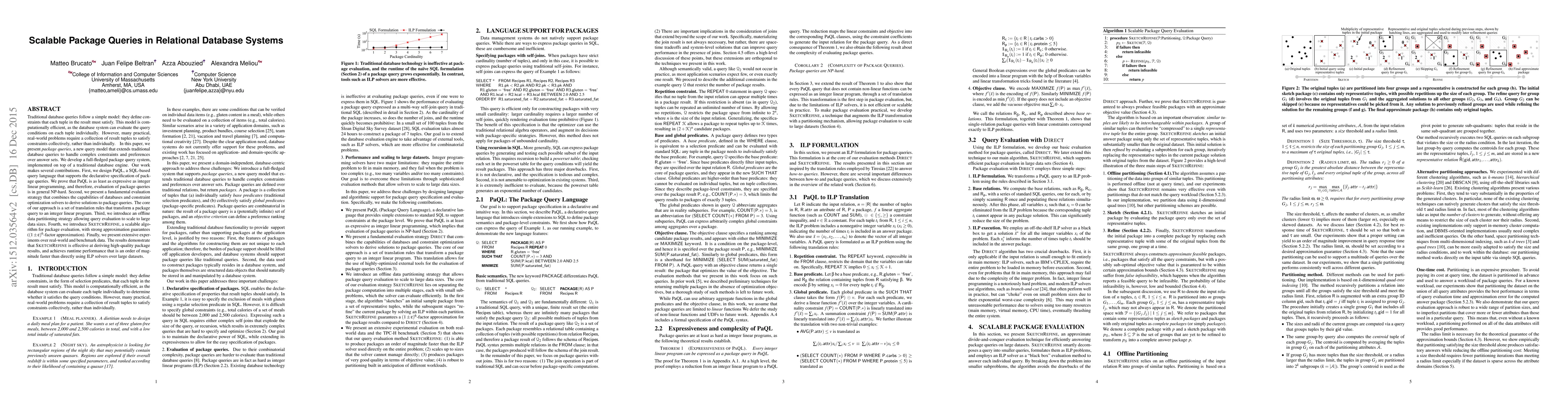 This paper introduces package queries, an extension of traditional database queries to handle complex constraints collectively over result sets. It presents PaQL, a SQL-based query language, and a scalable evaluation strategy combining databases and constraint solvers, achieving NP-hard complexity. The proposed SketchRefine algorithm offers a scalable solution with strong approximation guarantees, significantly improving performance over large datasets.