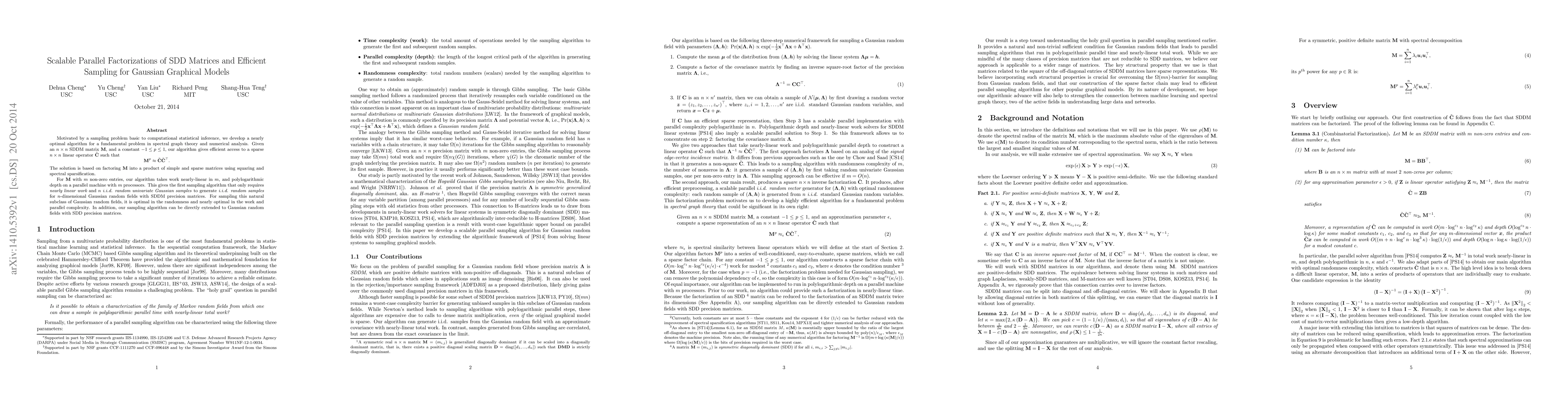 This paper presents a nearly optimal algorithm for scalable parallel factorization of SDDM matrices, achieving efficient sampling for Gaussian graphical models. The algorithm leverages spectral sparsification and parallel processing to factorize the matrix into sparse components, enabling nearly linear work and polylogarithmic depth on parallel machines, with optimal randomness and near-optimal work and parallel complexity for sampling Gaussian random fields.
