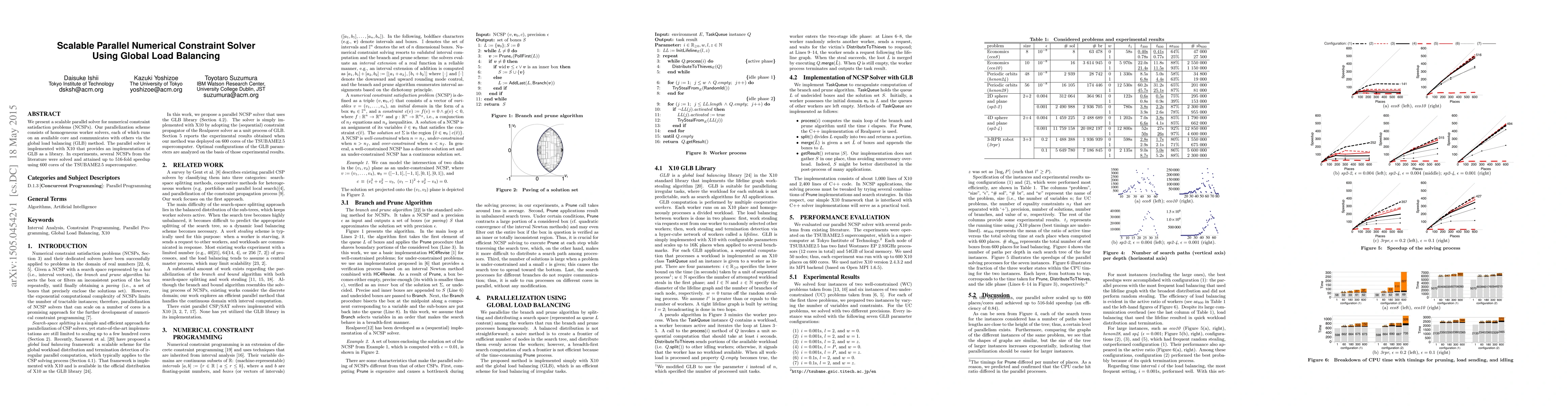This paper introduces a scalable parallel solver for numerical constraint satisfaction problems, utilizing homogeneous worker solvers and global load balancing to achieve up to 516-fold speedup on 600 cores of a supercomputer. The implementation leverages the X10 programming language for efficient parallelization.