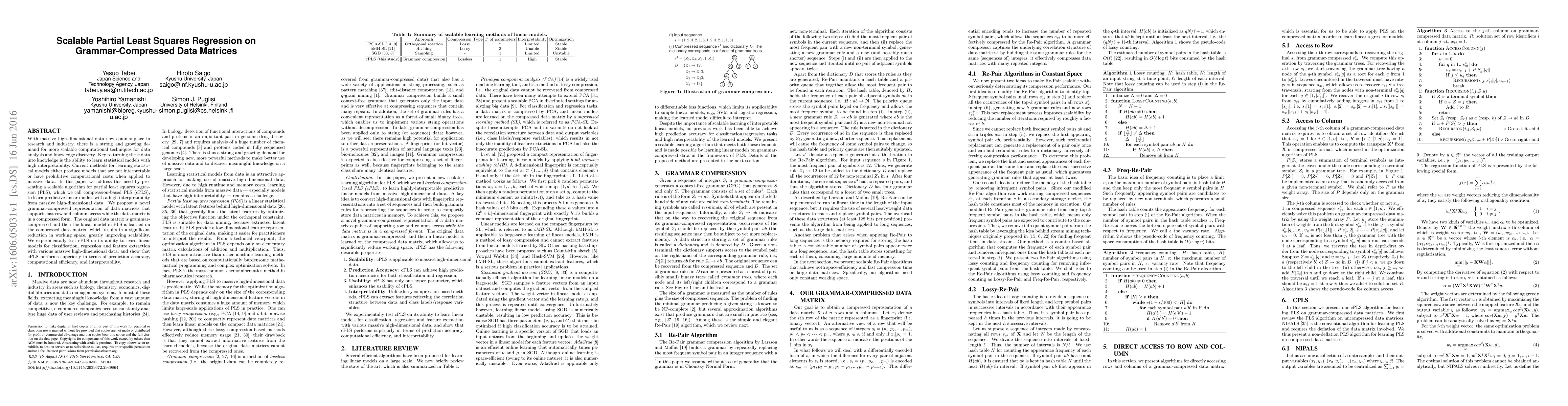 This paper introduces a scalable partial least squares regression (PLS) method called compression-based PLS (cPLS) for high-dimensional data analysis. It leverages grammar-compressed data matrices to significantly reduce working space, enhancing scalability, prediction accuracy, computational efficiency, and interpretability.