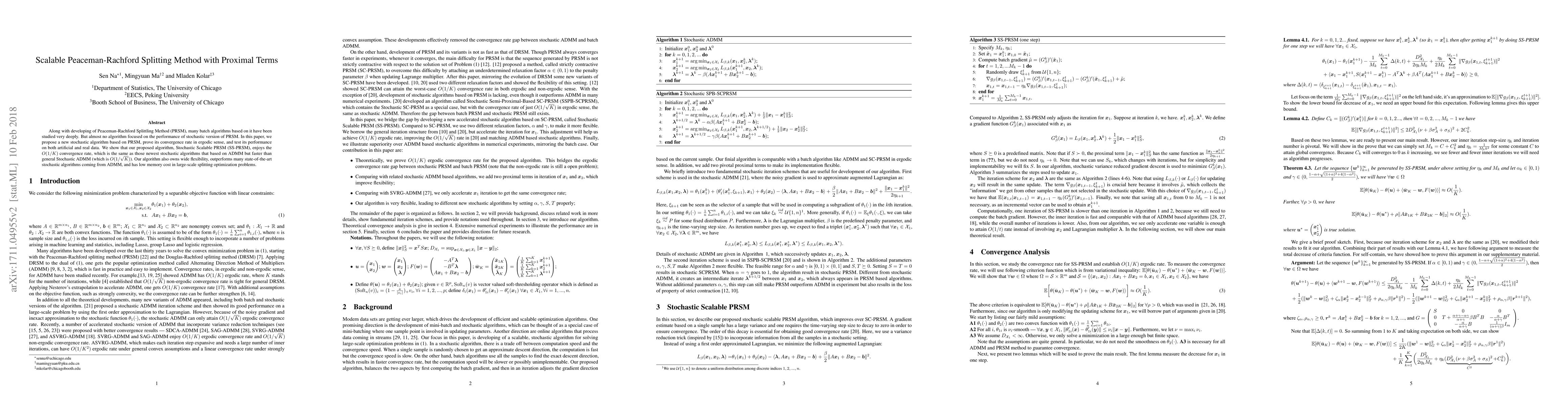 This paper proposes a new stochastic scalable Peaceman-Rachford Splitting Method (SS-PRSM) with a convergence rate of $O(1/K)$, outperforming general Stochastic ADMM while maintaining flexibility and low memory cost for large-scale optimization problems. The algorithm's performance is tested on both artificial and real data.