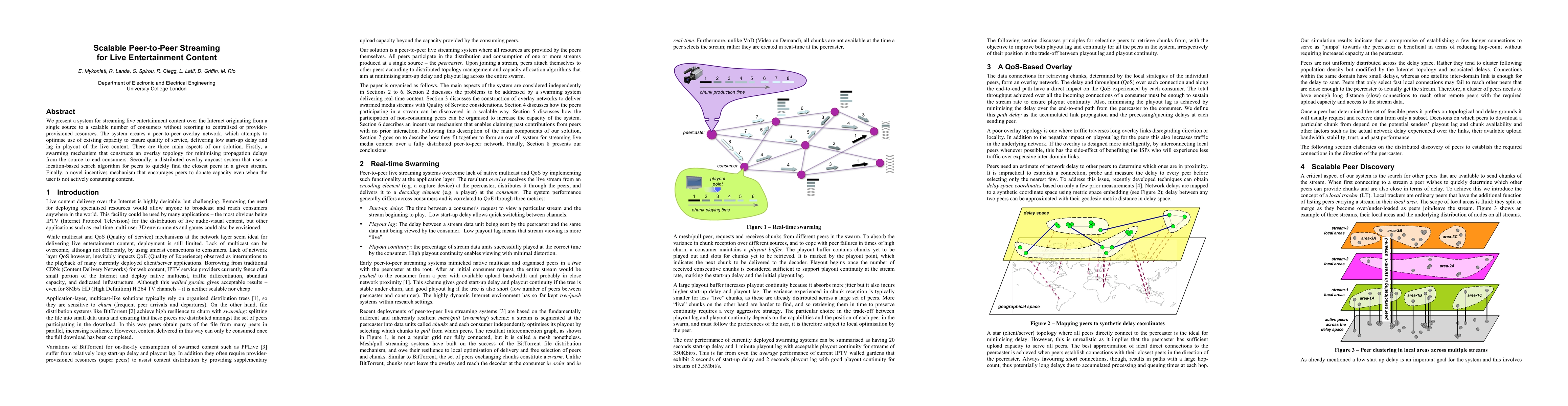 This paper proposes a scalable peer-to-peer system for streaming live entertainment content, utilizing a swarming mechanism to minimize delays, a distributed overlay anycast system for efficient peer discovery, and an incentives mechanism to encourage peer capacity donation.