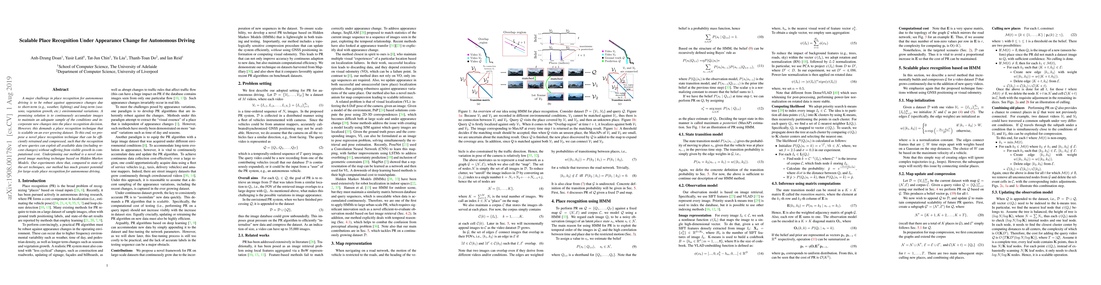 A major challenge in place recognition for autonomous driving is to be robust against appearance changes due to short-term (e.g., weather, lighting) and long-term (seasons, vegetation growth, etc.) environmental variations. A promising solution is to continuously accumulate images to maintain an adequate sample of the conditions and incorporate new changes into the place recognition decision. However, this demands a place recognition technique that is scalable on an ever growing dataset. To this end, we propose a novel place recognition technique that can be efficiently retrained and compressed, such that the recognition of new queries can exploit all available data (including recent changes) without suffering from visible growth in computational cost. Underpinning our method is a novel temporal image matching technique based on Hidden Markov Models. Our experiments show that, compared to state-of-the-art techniques, our method has much greater potential for large-scale place recognition for autonomous driving.