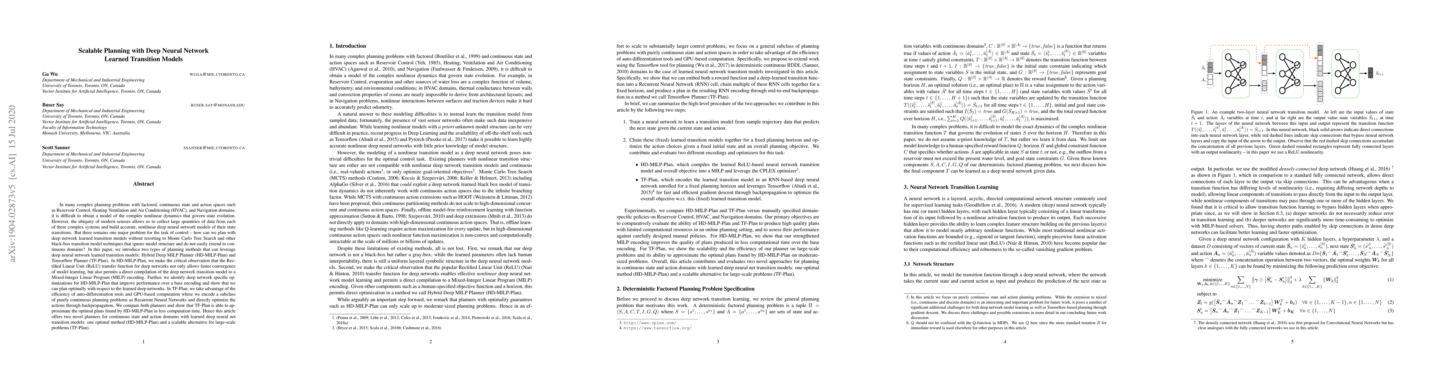 This paper introduces two planning methods—Hybrid Deep MILP Planner (HD-MILP-Plan) and Tensorflow Planner (TF-Plan)—to plan with deep neural network learned transition models in complex domains with mixed discrete and continuous state spaces. HD-MILP-Plan leverages the structure of deep networks to compile them into Mixed-Integer Linear Programs, while TF-Plan uses auto-differentiation and GPU computation for continuous planning.