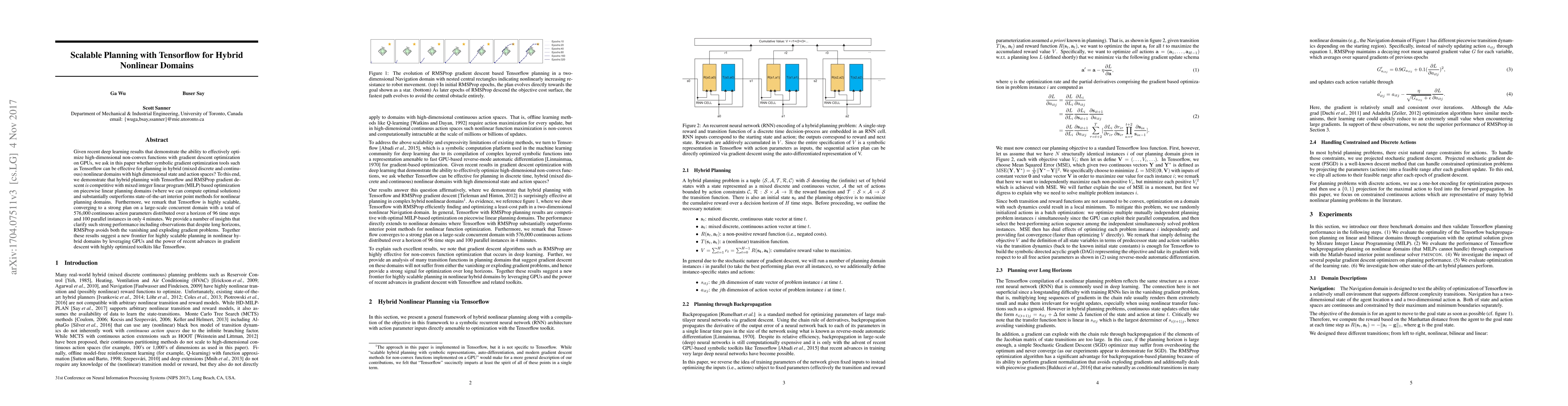 This paper explores the effectiveness of Tensorflow for planning in hybrid nonlinear domains, demonstrating competitive performance against MILP-based optimization and superior results over interior point methods. Tensorflow with RMSProp gradient descent scales well, successfully converging to a strong plan in a large-scale domain with 576,000 continuous action parameters in just 4 minutes.