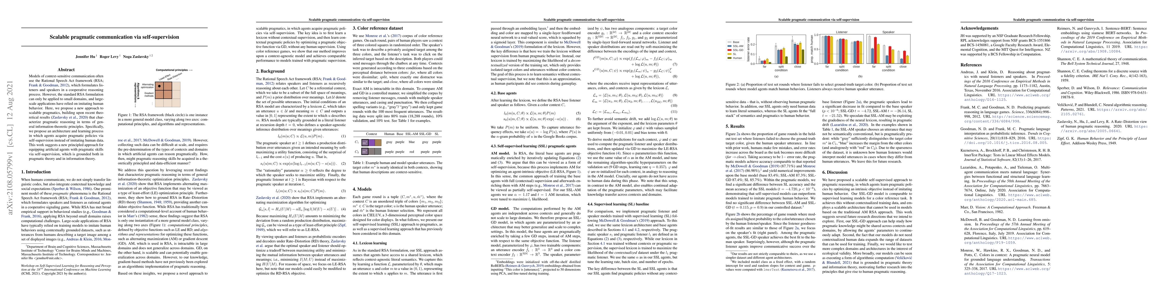 Models of context-sensitive communication often use the Rational Speech Act framework (RSA; Frank & Goodman, 2012), which formulates listeners and speakers in a cooperative reasoning process. However, the standard RSA formulation can only be applied to small domains, and large-scale applications have relied on imitating human behavior. Here, we propose a new approach to scalable pragmatics, building upon recent theoretical results (Zaslavsky et al., 2020) that characterize pragmatic reasoning in terms of general information-theoretic principles. Specifically, we propose an architecture and learning process in which agents acquire pragmatic policies via self-supervision instead of imitating human data. This work suggests a new principled approach for equipping artificial agents with pragmatic skills via self-supervision, which is grounded both in pragmatic theory and in information theory.