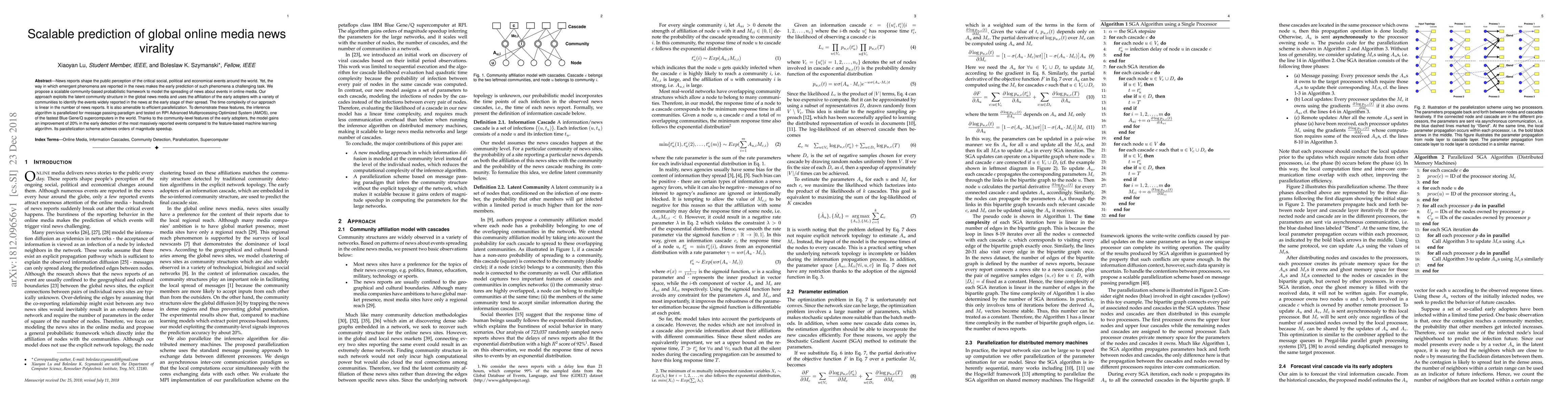 This paper proposes a scalable probabilistic framework to predict the virality of global online news by leveraging community structures and early adopters' affiliations. The approach demonstrates linear time complexity and significant speedup through parallelization, achieving a 20% improvement in early detection of widely reported events compared to traditional machine learning methods.