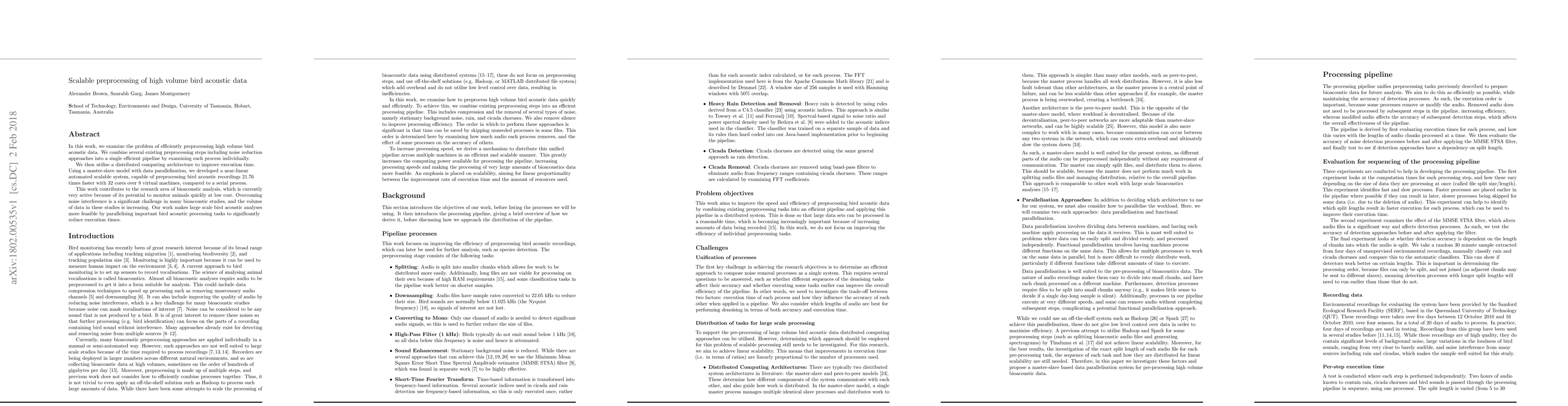 In this work, we examine the problem of efficiently preprocessing high volume bird acoustic data. We combine several existing preprocessing steps including noise reduction approaches into a single efficient pipeline by examining each process individually. We then utilise a distributed computing architecture to improve execution time. Using a master-slave model with data parallelisation, we developed a near-linear automated scalable system, capable of preprocessing bird acoustic recordings 21.76 times faster with 32 cores over 8 virtual machines, compared to a serial process. This work contributes to the research area of bioacoustic analysis, which is currently very active because of its potential to monitor animals quickly at low cost. Overcoming noise interference is a significant challenge in many bioacoustic studies, and the volume of data in these studies is increasing. Our work makes large scale bird acoustic analyses more feasible by parallelising important bird acoustic processing tasks to significantly reduce execution times.