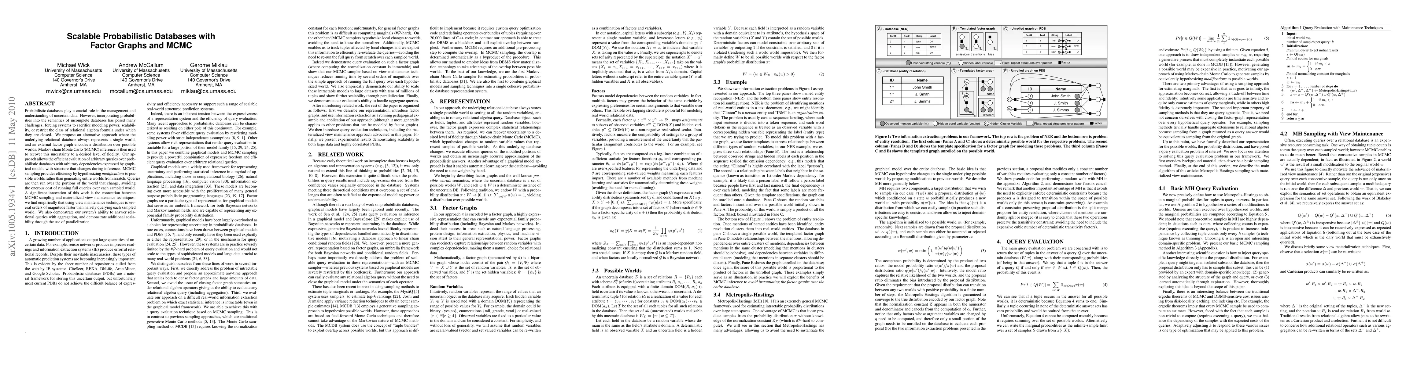 This paper proposes a scalable probabilistic database system using factor graphs and Markov chain Monte Carlo (MCMC) to manage uncertain data efficiently. It leverages MCMC sampling and materialized view maintenance techniques to handle complex dependencies and improve query efficiency, demonstrating significant scalability and performance gains.