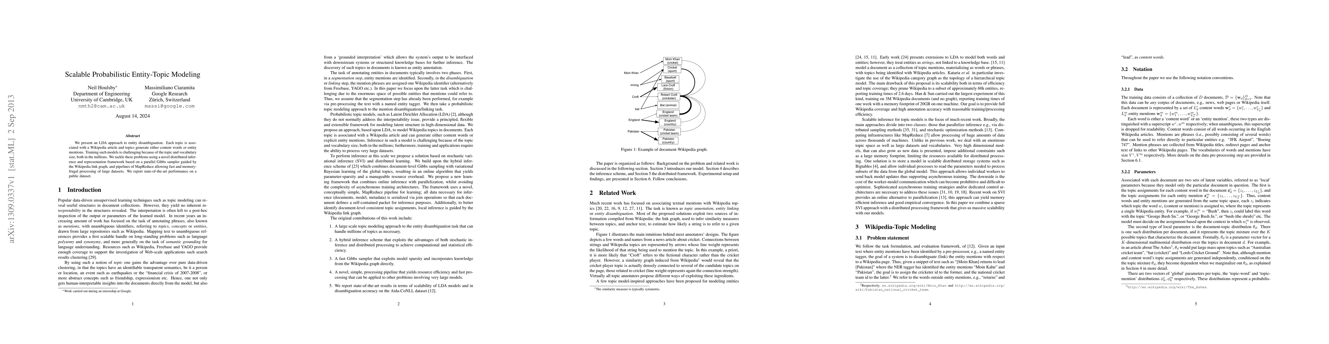 This paper introduces a scalable probabilistic entity-topic modeling approach based on LDA, associating topics with Wikipedia articles to disambiguate entities. The authors employ a distributed inference framework and MapReduce for efficient processing of large-scale datasets, achieving state-of-the-art performance.