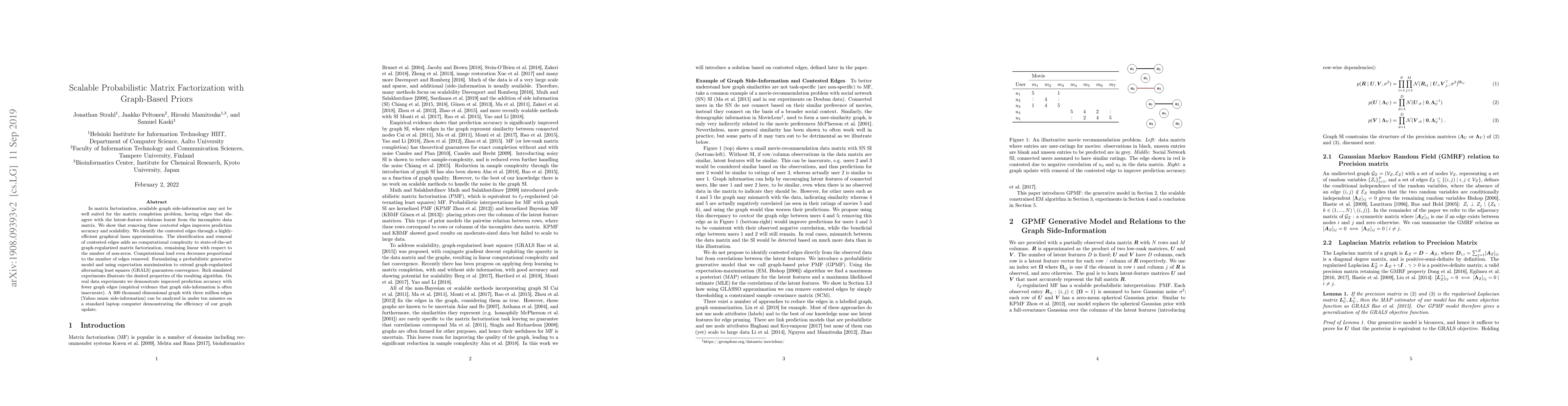 This paper proposes a scalable probabilistic matrix factorization method that identifies and removes "contested" edges in graph side-information to improve prediction accuracy and efficiency. The contested edges are efficiently detected using a graphical lasso approximation, and their removal does not increase computational complexity.