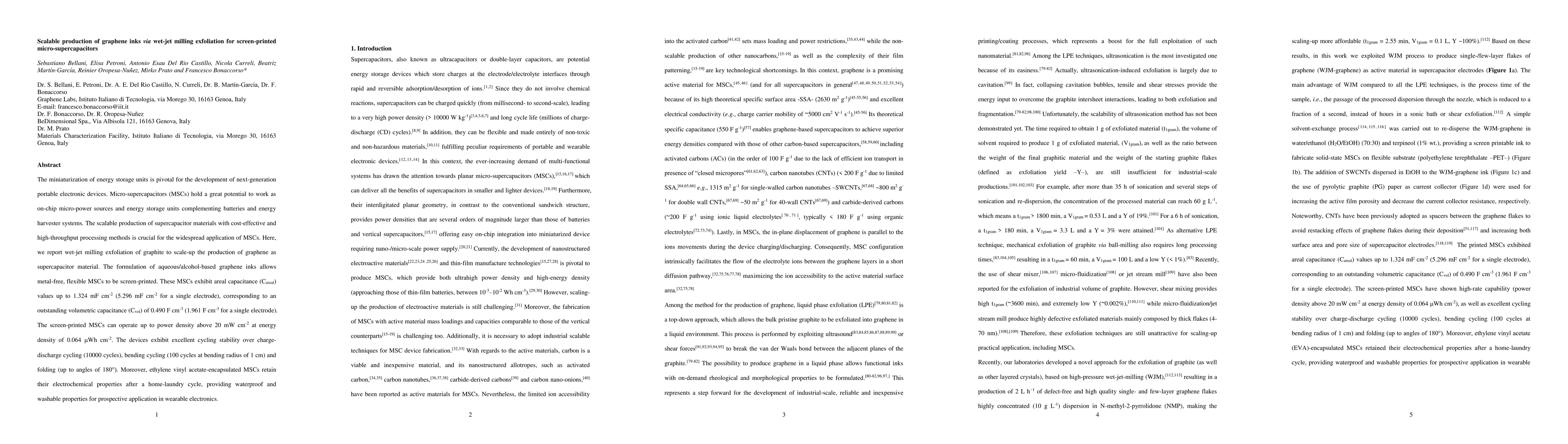 This paper presents a scalable method for producing graphene inks via wet-jet milling for screen-printed micro-supercapacitors (MSCs), achieving high areal and volumetric capacitance values. The flexible, washable MSCs show excellent stability and performance, making them suitable for wearable electronics.