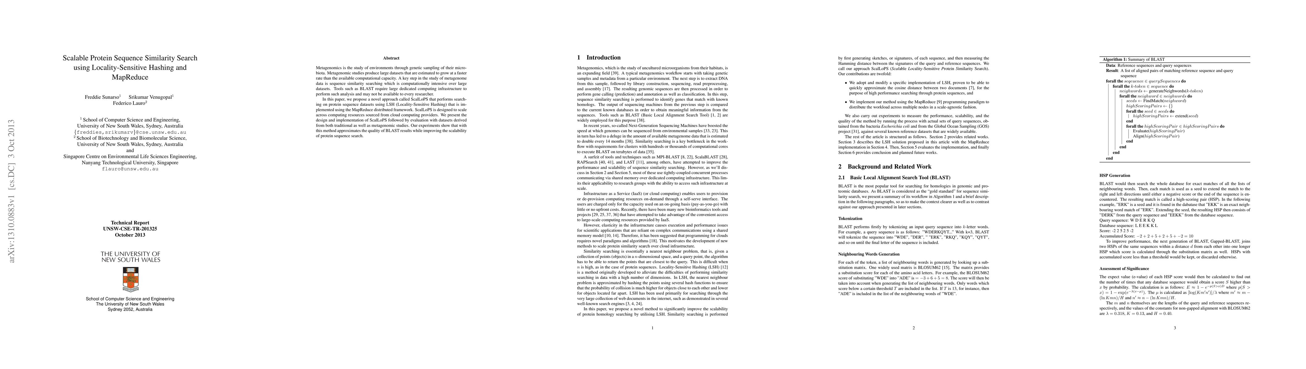 This paper introduces ScalLoPS, a scalable protein sequence similarity search method using Locality-Sensitive Hashing (LSH) and MapReduce, designed to handle large metagenomic datasets efficiently. The approach aims to improve scalability and accessibility over traditional tools like BLAST, demonstrating competitive results in sequence similarity searches.