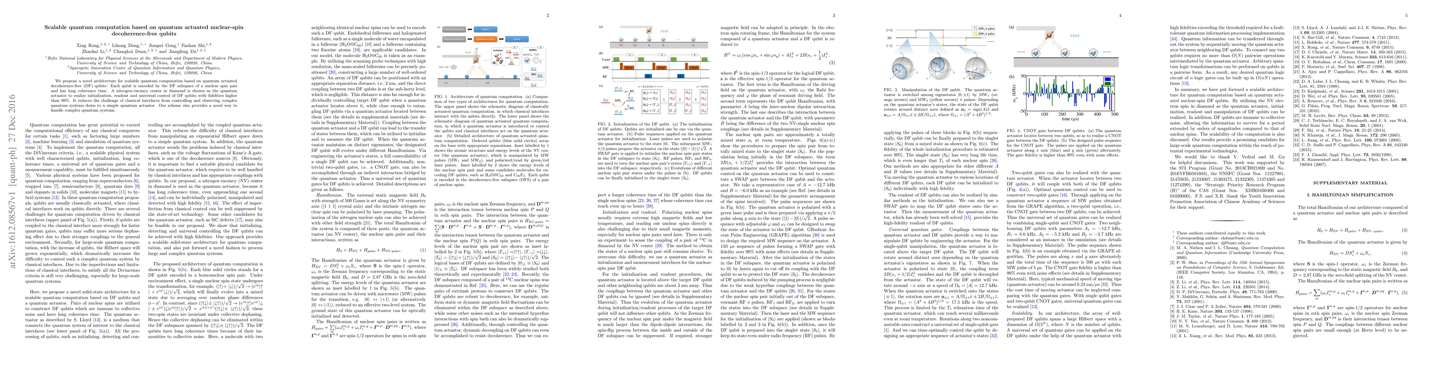 This paper proposes a scalable quantum computing architecture using decoherence-free qubits encoded in nuclear spin pairs, with nitrogen-vacancy centers in diamond serving as quantum actuators for high-fidelity initialization, readout, and control. The approach simplifies the management of complex quantum systems.
