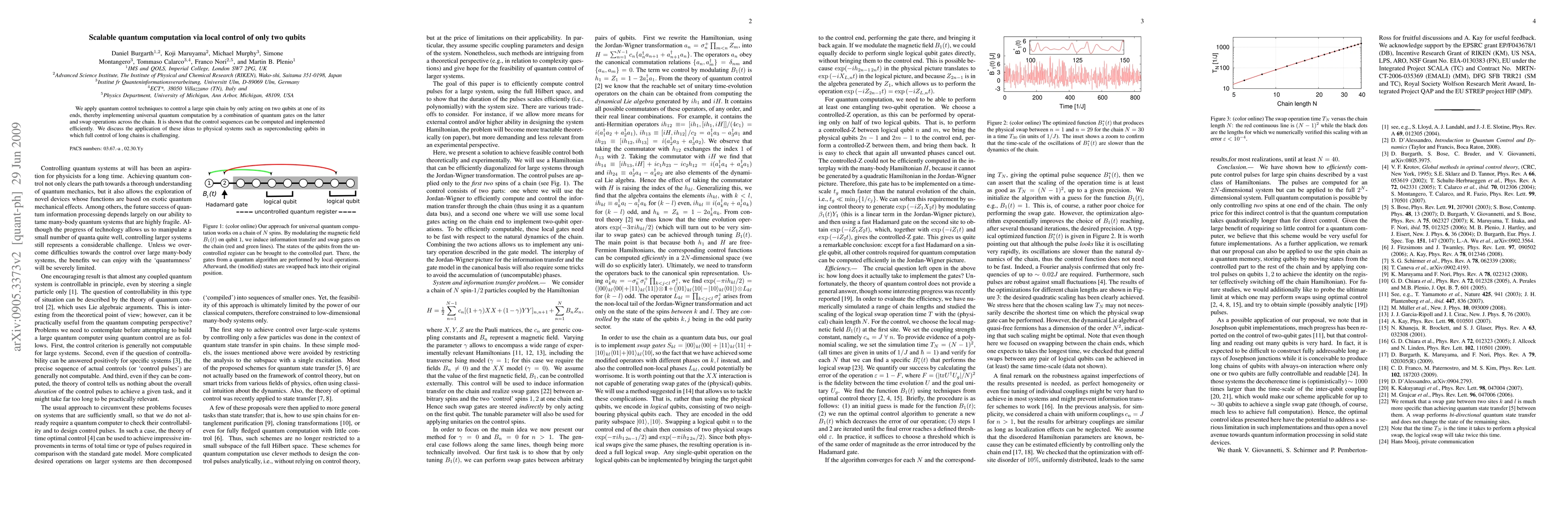 This paper proposes a scalable quantum computation method that controls a large spin chain by manipulating only two qubits at one end, enabling universal quantum computation through quantum gates and swap operations. The control sequences are efficiently computable and applicable to physical systems like superconducting qubits where full control is difficult.