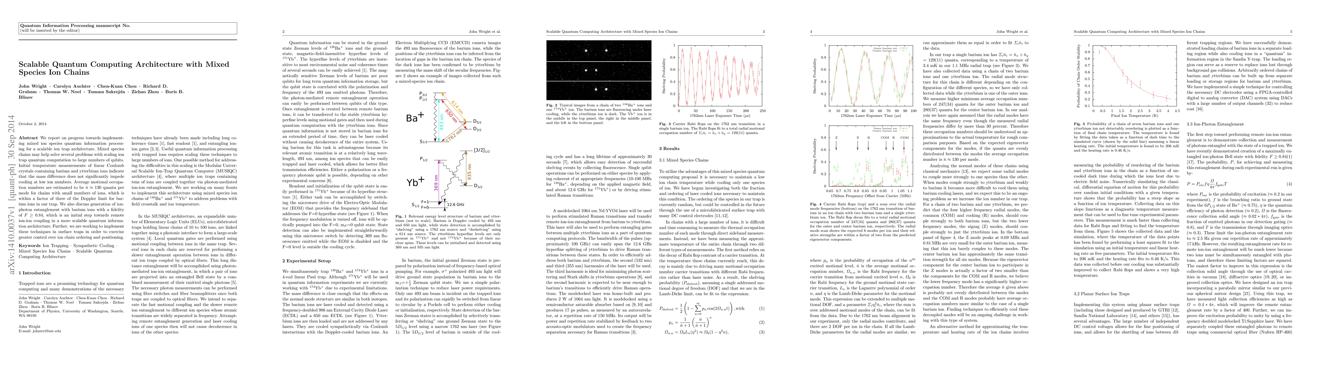 This paper discusses advancements in scalable quantum computing using mixed species ion chains, showing that barium and ytterbium ions can be cooled effectively despite mass differences. Initial results demonstrate ion-photon entanglement with high fidelity, paving the way for remote ion-ion coupling in scalable quantum architectures.