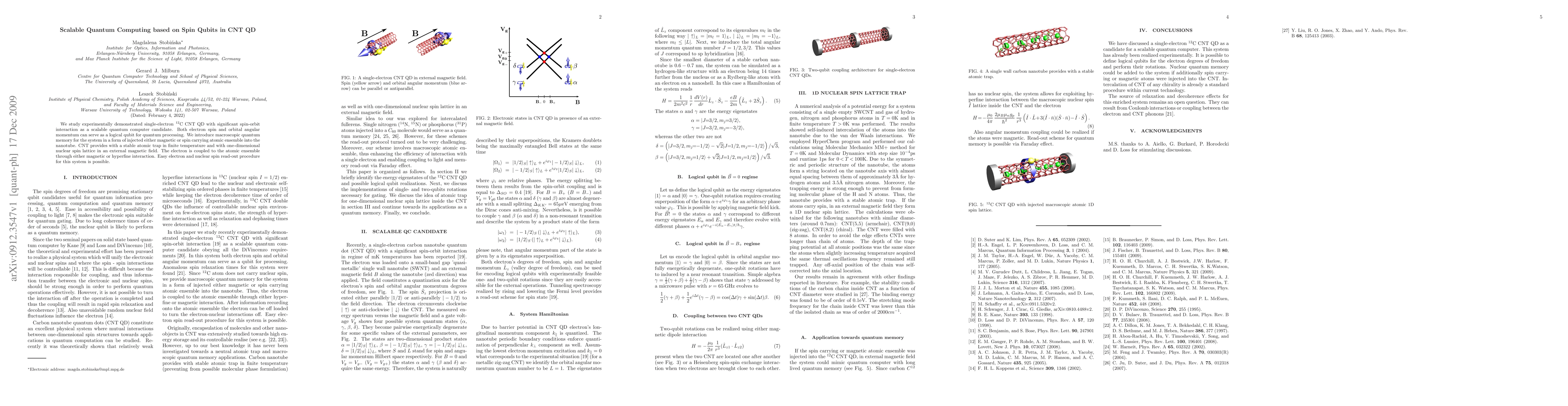We study experimentally demonstrated single-electron ${}^{12}$C CNT QD with significant spin-orbit interaction as a scalable quantum computer candidate. Both electron spin and orbital angular momentum can serve as a logical qubit for quantum processing. We introduce macroscopic quantum memory for the system in a form of injected either magnetic or spin carrying atomic ensemble into the nanotube. CNT provides with a stable atomic trap in finite temperature and with one-dimensional nuclear spin lattice in an external magnetic field. The electron is coupled to the atomic ensemble through either magnetic or hyperfine interaction. Easy electron and nuclear spin read-out procedure for this system is possible.