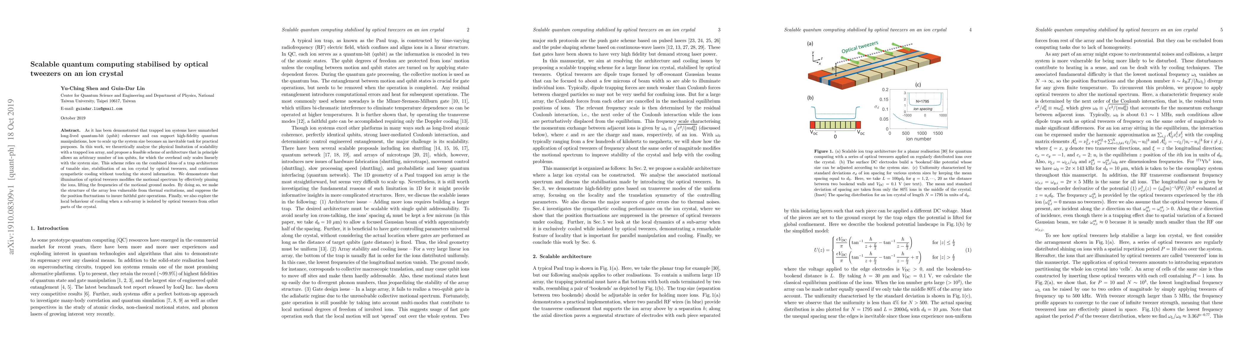 This paper proposes a scalable architecture for trapped ion quantum computing, utilizing optical tweezers to stabilize ion crystals and sympathetic cooling to maintain coherence. The scheme allows linear scaling with minimal overhead, enhancing the system's robustness against thermal excitations and ensuring reliable quantum gate operations.
