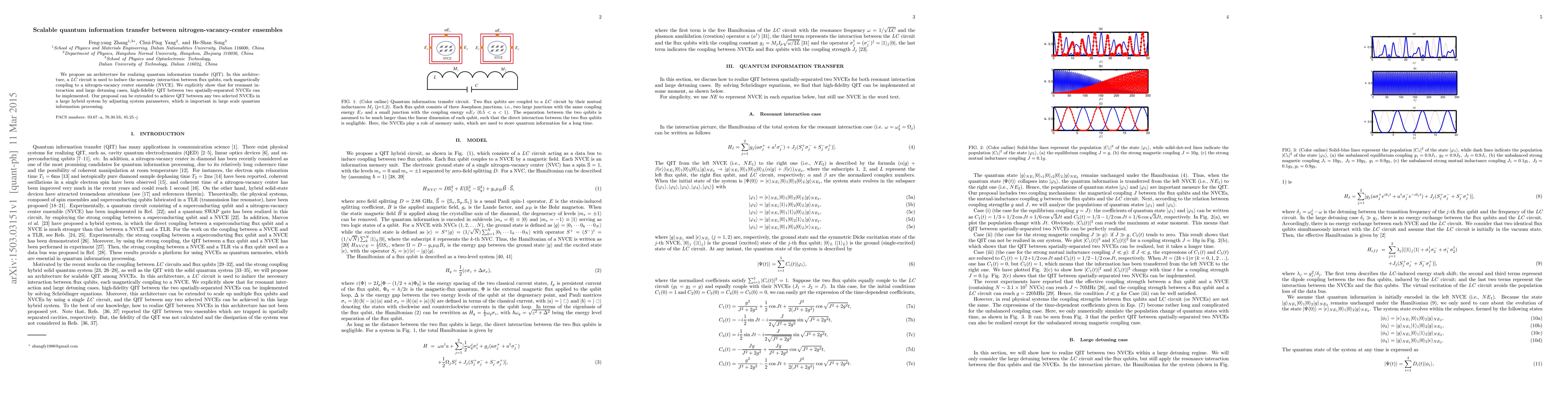 This paper proposes an architecture for scalable quantum information transfer using LC circuits to interact flux qubits with nitrogen-vacancy-center ensembles, demonstrating high-fidelity transfer for resonant and large detuning cases, and suggesting scalability for large-scale quantum information processing.