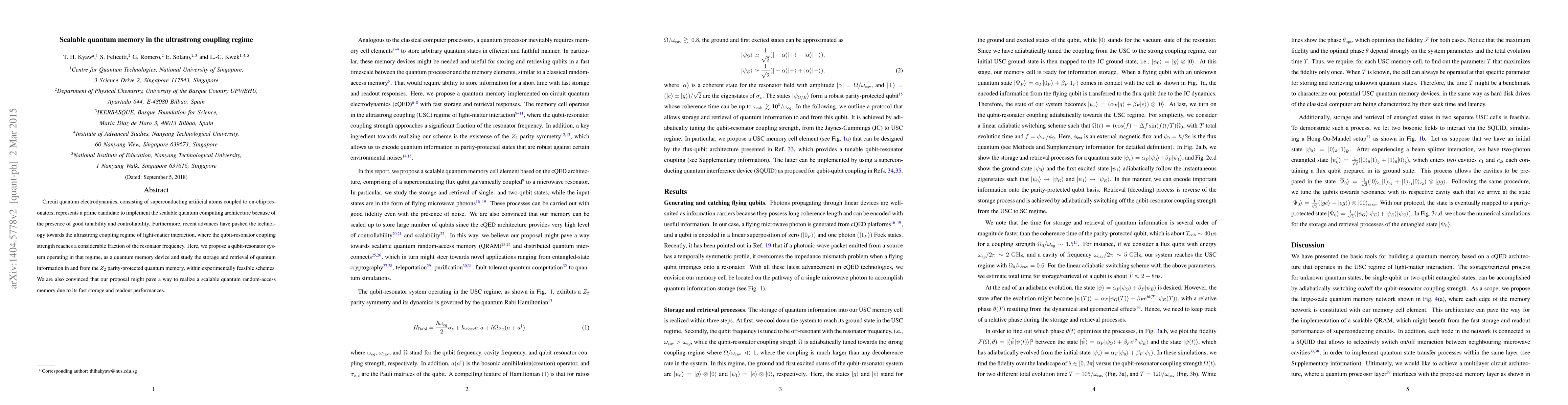 This paper proposes a scalable quantum memory system using superconducting qubits in the ultrastrong coupling regime with on-chip resonators, demonstrating efficient storage and retrieval of quantum information, and suggesting potential for a scalable quantum random-access memory.