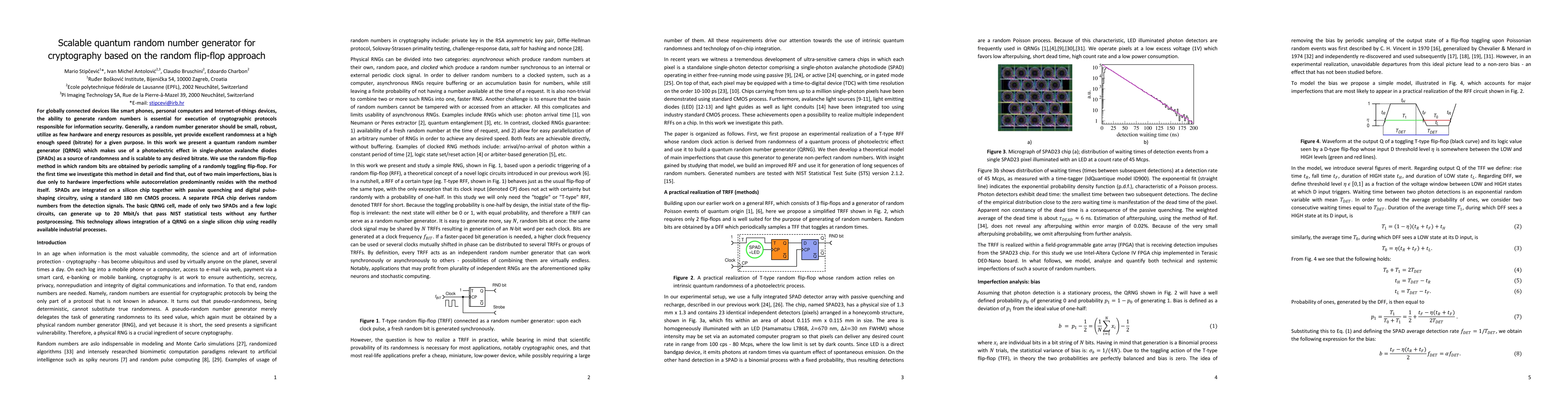 This paper presents a scalable quantum random number generator (QRNG) based on the random flip-flop approach, utilizing single-photon avalanche diodes (SPADs) for randomness. The QRNG can generate up to 20 Mbit/s of random bits that pass NIST statistical tests without postprocessing, making it suitable for cryptographic applications in connected devices.
