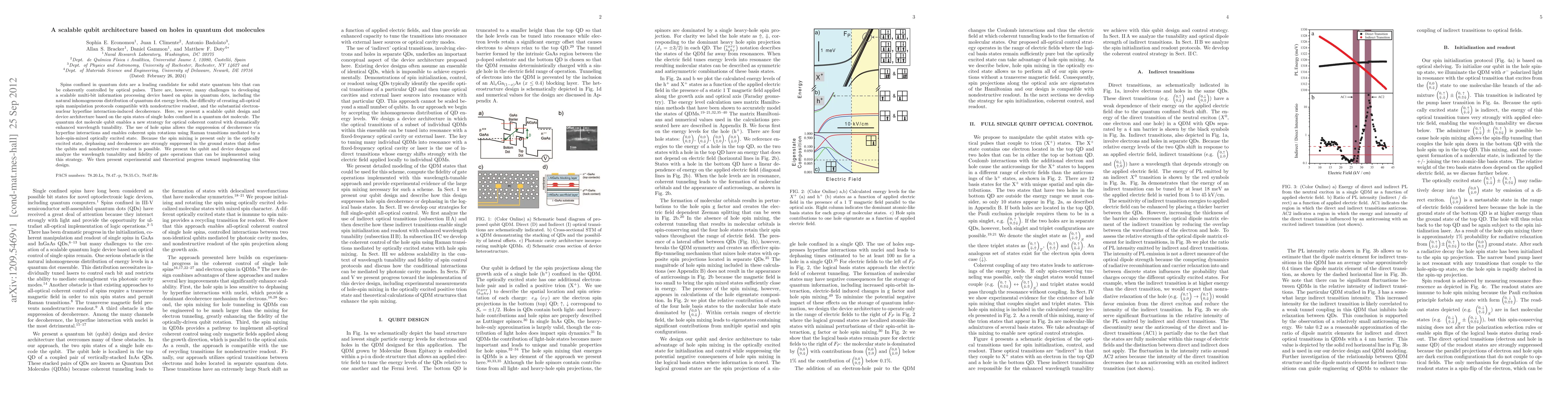 This paper proposes a scalable qubit architecture using hole spins in quantum dot molecules to overcome challenges in solid-state quantum computing, achieving enhanced wavelength tunability and reduced decoherence through Raman transitions and nondestructive readout. The design aims to enable coherent control and high fidelity gate operations.