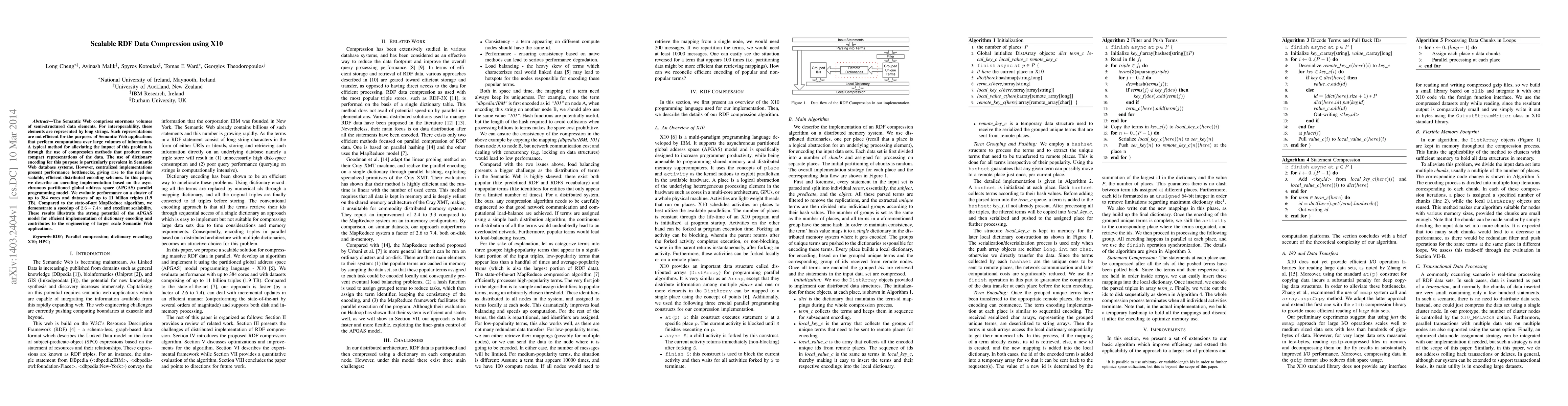 This paper introduces a scalable RDF data compression method using X10, an APGAS parallel programming model. It outperforms the MapReduce algorithm by 2.6-7.4x, demonstrating the APGAS model's potential for efficient dictionary encoding in large-scale Semantic Web applications.