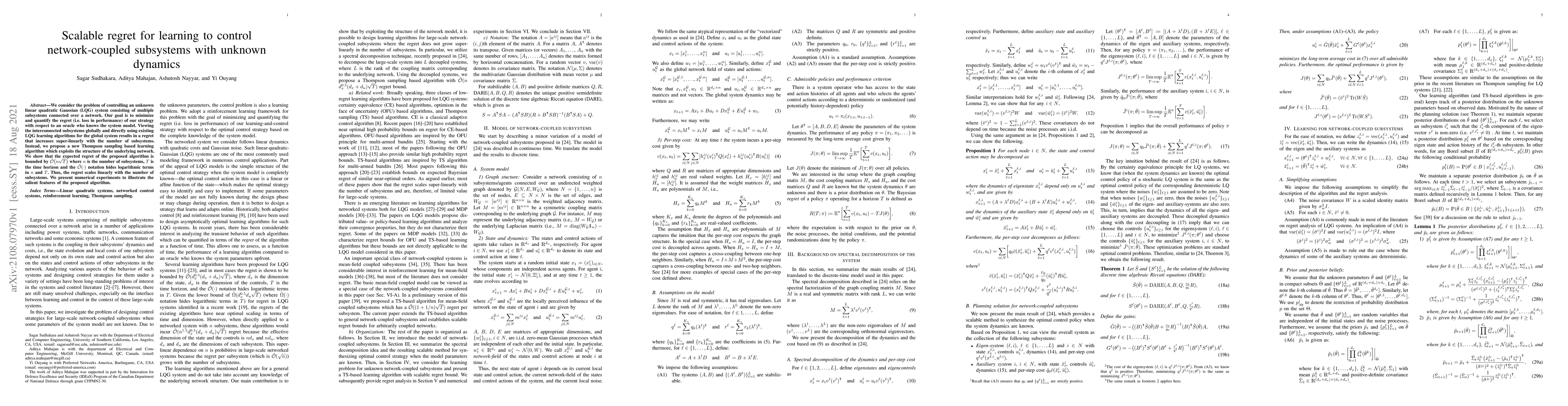 This paper proposes a Thompson sampling-based learning algorithm to control network-coupled subsystems with unknown dynamics, achieving scalable regret that scales linearly with the number of subsystems. The algorithm outperforms existing methods by exploiting network structure, resulting in a regret bound of $\tilde{\mathcal{O}} \big( n \sqrt{T} \big)$.