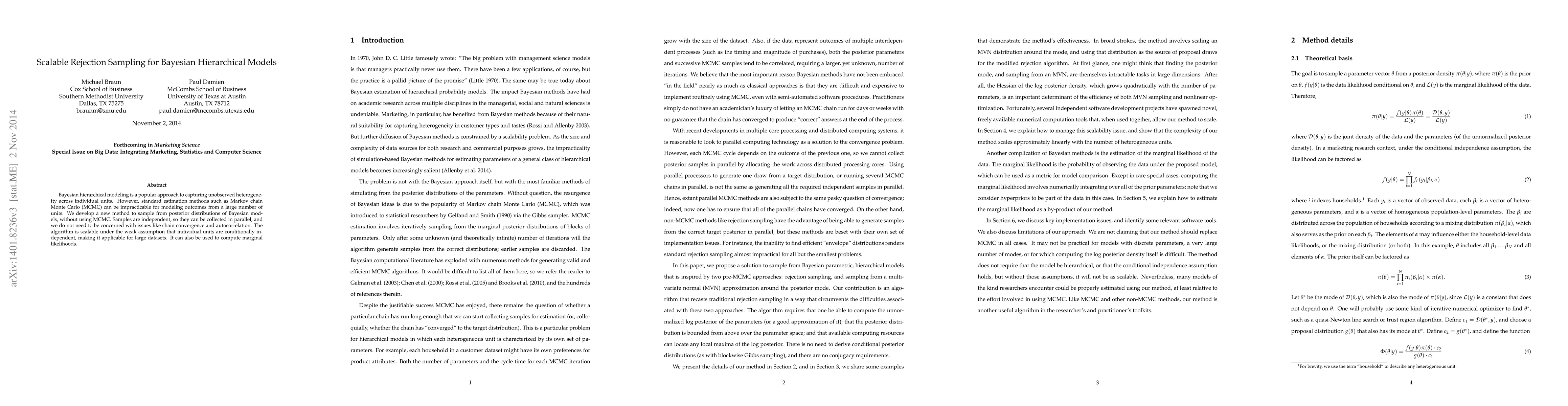This paper introduces a scalable rejection sampling method for Bayesian hierarchical models, enabling independent, parallel sampling without MCMC, thus addressing the impracticality of standard methods for large datasets. The method leverages conditional independence of individual units and can compute marginal likelihoods.