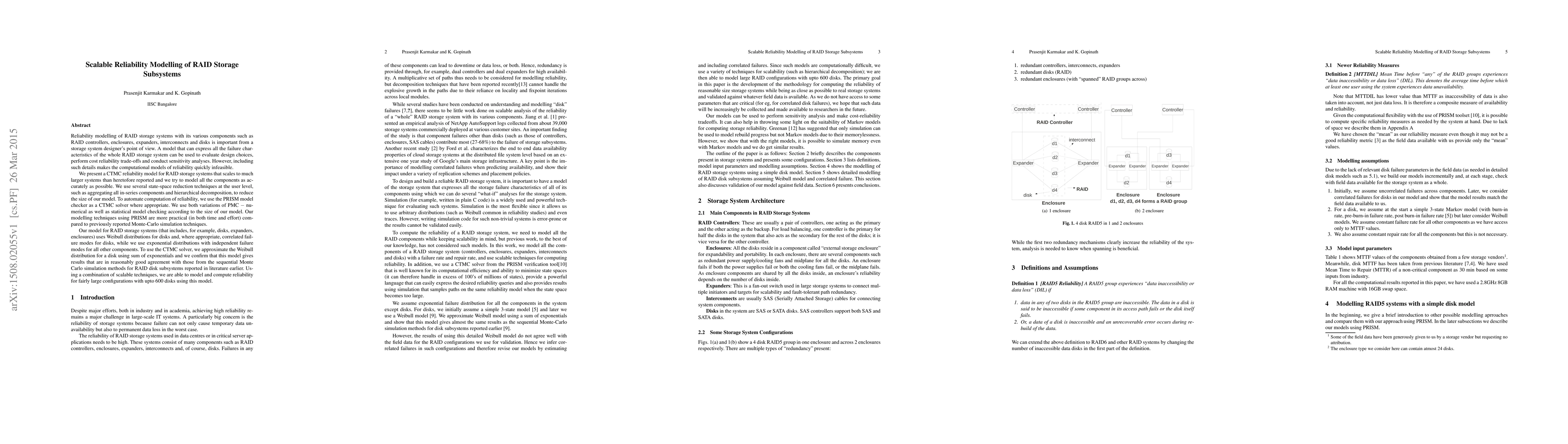 This paper presents a scalable Continuous Time Markov Chain (CTMC) reliability model for RAID storage systems, incorporating various components like disks, controllers, and expanders. The authors employ state-space reduction techniques and the PRISM model checker to manage computational complexity, enabling practical reliability analysis for large systems with up to 600 disks.
