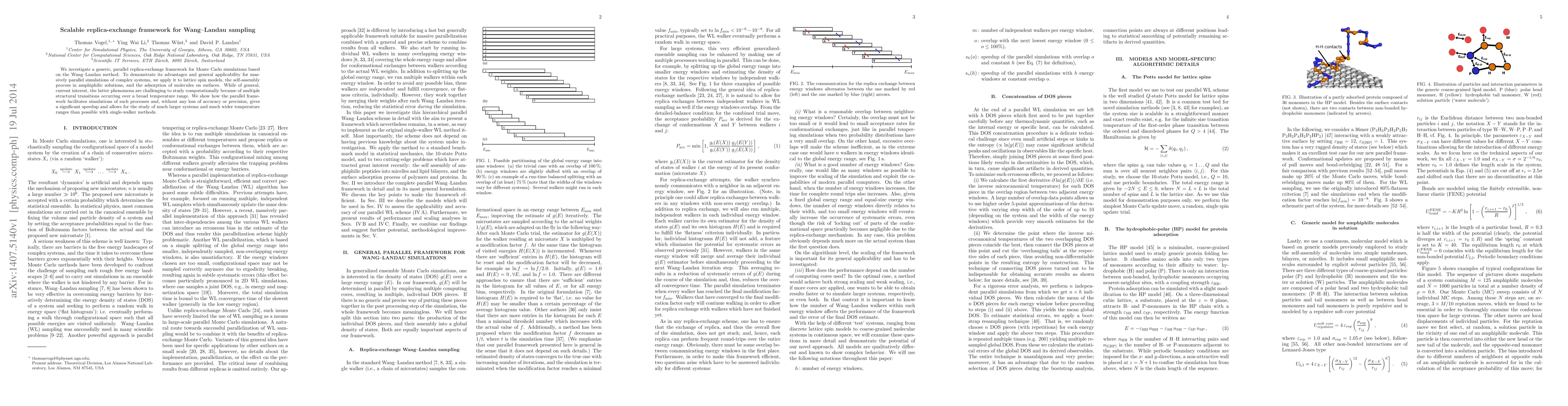 This paper presents a scalable, parallel replica-exchange framework for Monte Carlo simulations using Wang-Landau sampling, demonstrating its effectiveness in simulating complex systems like lattice spin models, amphiphilic solutions, and molecular adsorption. The framework significantly speeds up simulations and allows for the study of larger systems and broader temperature ranges compared to single-walker methods.