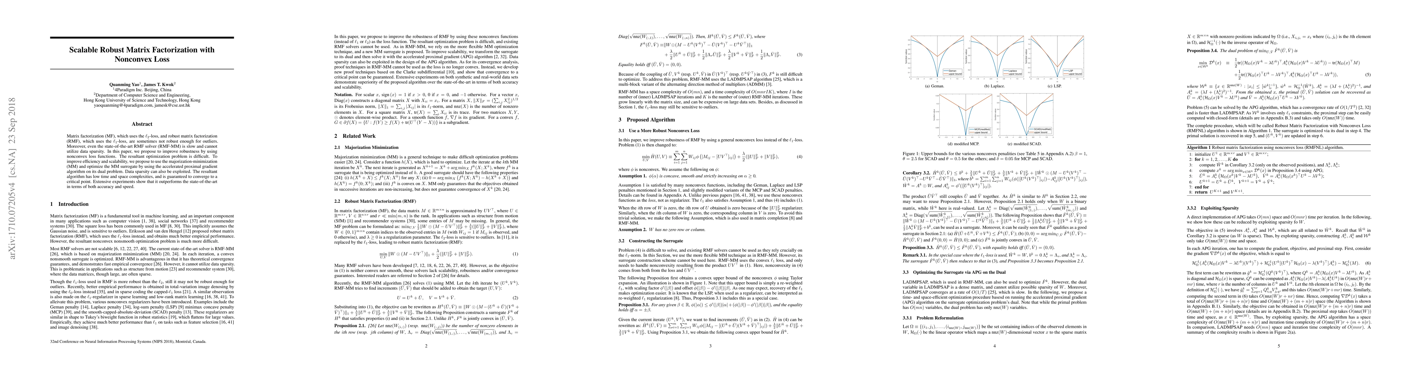 Robust matrix factorization (RMF), which uses the $\ell_1$-loss, often outperforms standard matrix factorization using the $\ell_2$-loss, particularly when outliers are present. The state-of-the-art RMF solver is the RMF-MM algorithm, which, however, cannot utilize data sparsity. Moreover, sometimes even the (convex) $\ell_1$-loss is not robust enough. In this paper, we propose the use of nonconvex loss to enhance robustness. To address the resultant difficult optimization problem, we use majorization-minimization (MM) optimization and propose a new MM surrogate. To improve scalability, we exploit data sparsity and optimize the surrogate via its dual with the accelerated proximal gradient algorithm. The resultant algorithm has low time and space complexities and is guaranteed to converge to a critical point. Extensive experiments demonstrate its superiority over the state-of-the-art in terms of both accuracy and scalability.