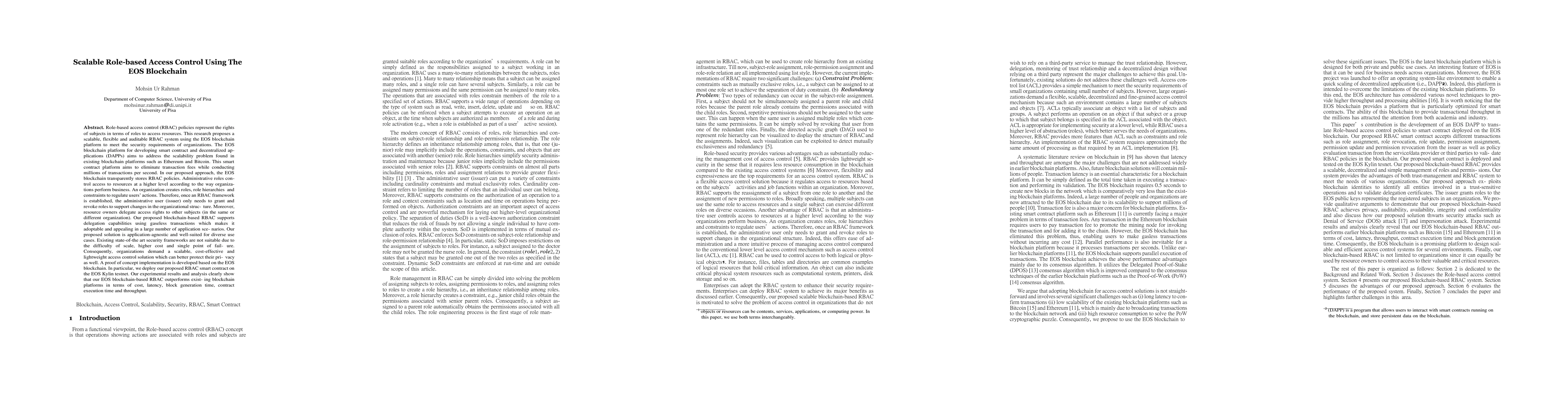 This paper proposes a scalable, flexible, and auditable role-based access control (RBAC) system using the EOS blockchain to address security needs and scalability issues of organizations. The EOS blockchain-based RBAC system supports delegation and gasless transactions, demonstrating superior performance in cost, latency, and throughput compared to existing frameworks.
