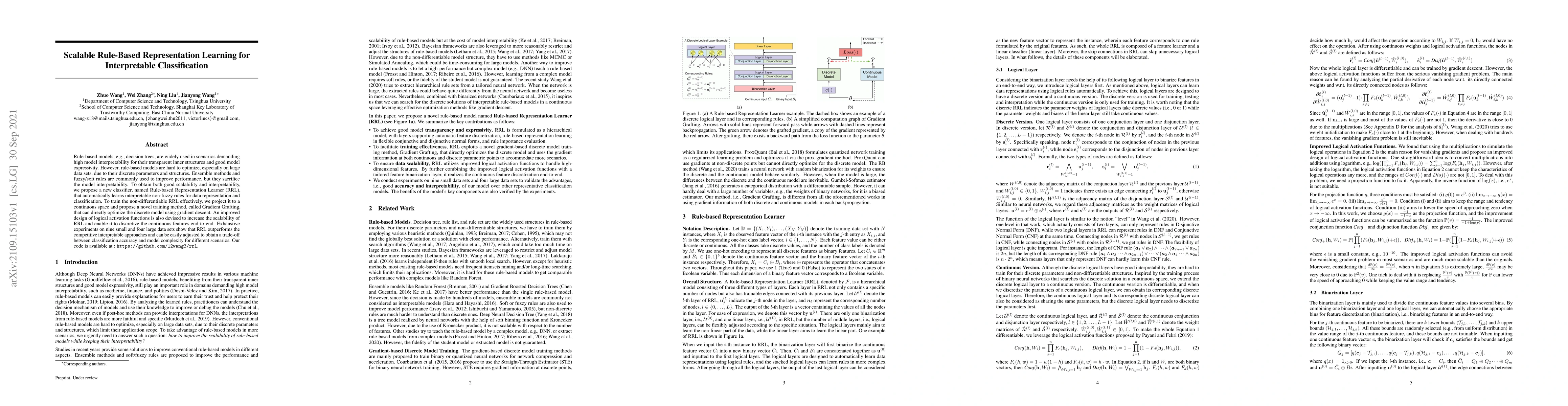 This paper proposes a scalable Rule-based Representation Learner (RRL) for interpretable classification, which automatically learns non-fuzzy rules. It employs Gradient Grafting to optimize the non-differentiable model and enhances scalability through logical activation functions, achieving better performance than other interpretable methods.