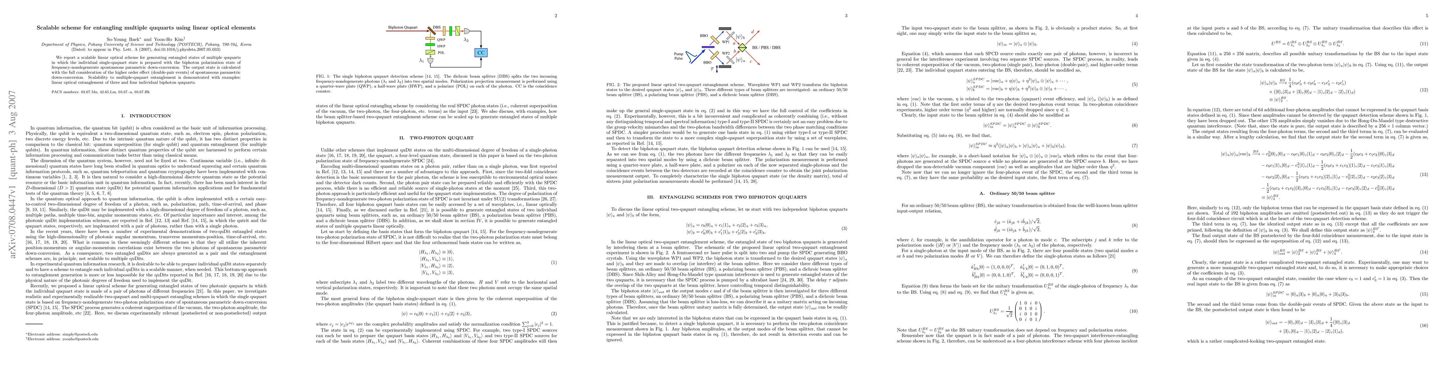 This paper presents a scalable linear optical scheme for generating entangled states of multiple ququarts using biphoton polarization states from frequency-nondegenerate spontaneous parametric down-conversion, considering higher-order effects, and demonstrates scalability through examples of three and four ququart entanglement.
