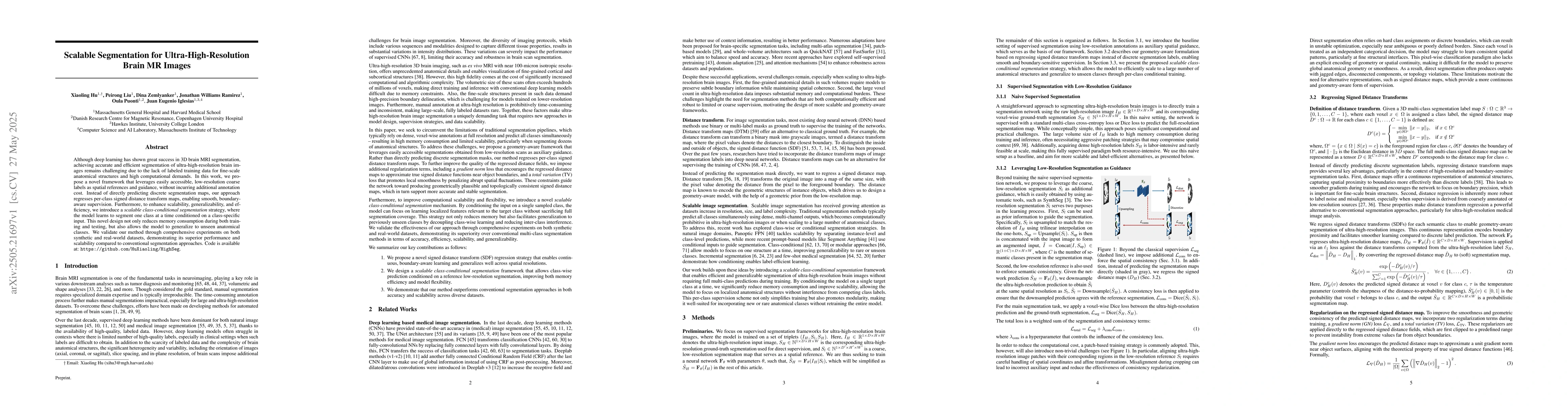 The research proposes a novel framework for scalable segmentation of ultra-high-resolution brain MR images, utilizing easily accessible low-resolution coarse labels and regressing per-class signed distance transform maps for smooth, boundary-aware supervision.