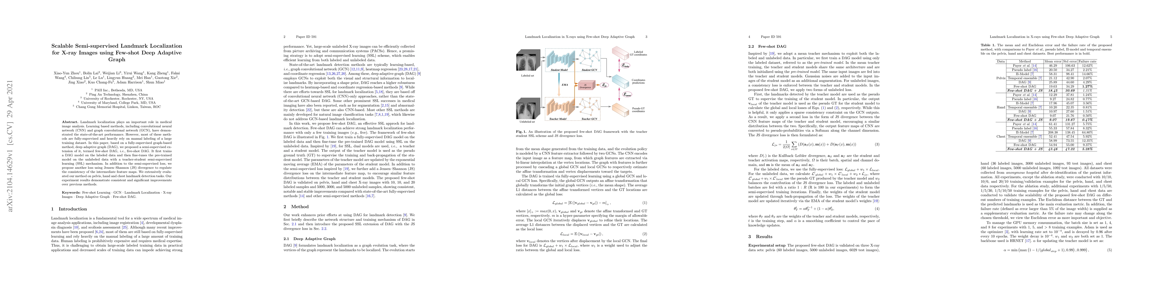 Landmark localization plays an important role in medical image analysis. Learning based methods, including CNN and GCN, have demonstrated the state-of-the-art performance. However, most of these methods are fully-supervised and heavily rely on manual labeling of a large training dataset. In this paper, based on a fully-supervised graph-based method, DAG, we proposed a semi-supervised extension of it, termed few-shot DAG, \ie five-shot DAG. It first trains a DAG model on the labeled data and then fine-tunes the pre-trained model on the unlabeled data with a teacher-student SSL mechanism. In addition to the semi-supervised loss, we propose another loss using JS divergence to regulate the consistency of the intermediate feature maps. We extensively evaluated our method on pelvis, hand and chest landmark detection tasks. Our experiment results demonstrate consistent and significant improvements over previous methods.