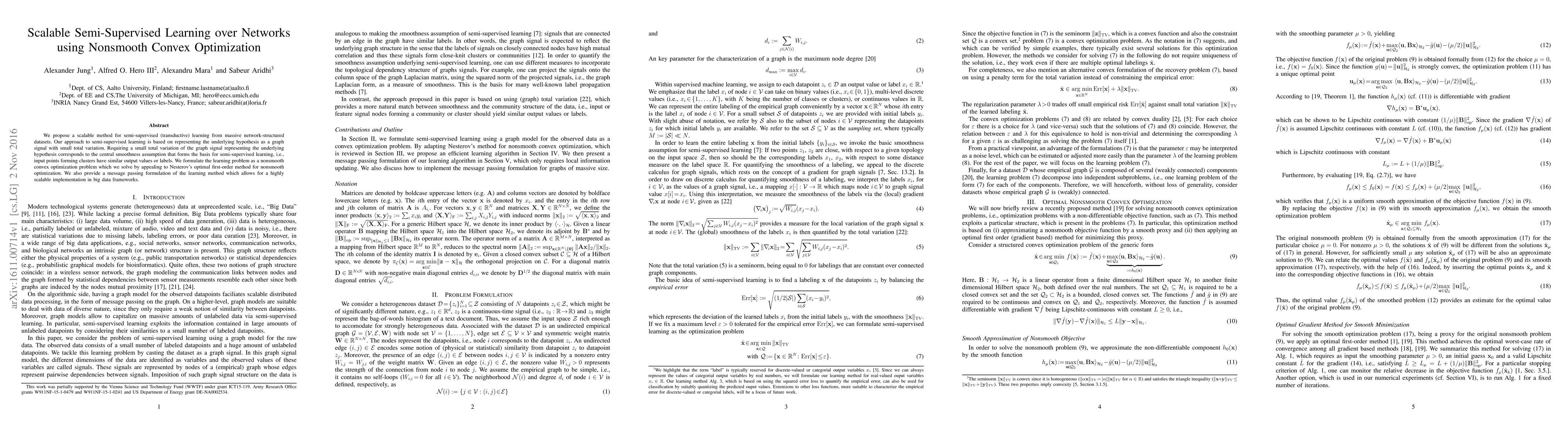 This paper introduces a scalable semi-supervised learning method for large network datasets based on graph signal total variation. It formulates the problem as a nonsmooth convex optimization and solves it using Nesterov's optimal first-order method, with a scalable message passing implementation for big data.