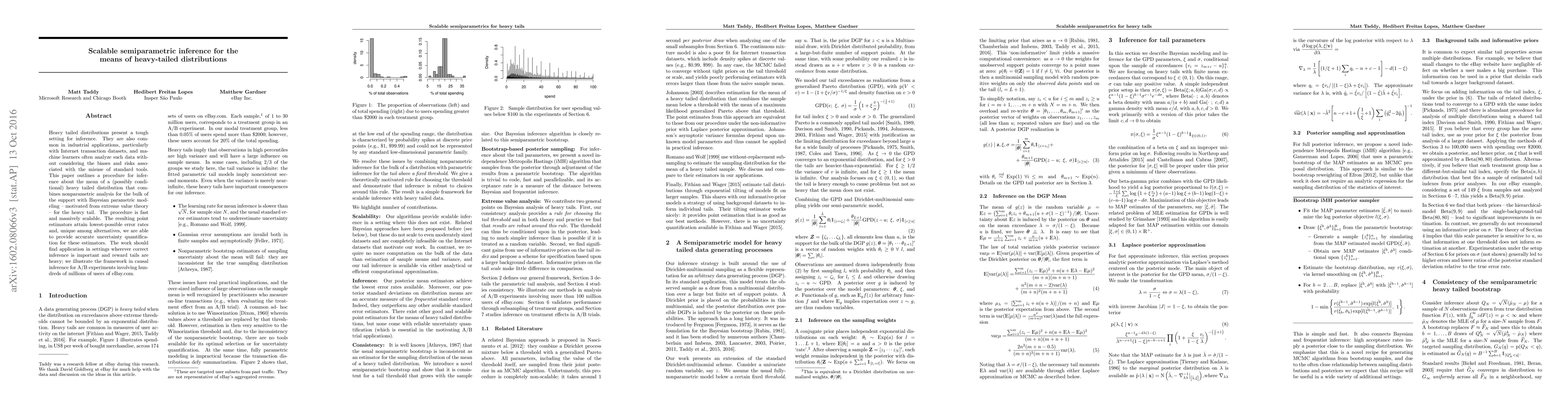 Heavy tailed distributions present a tough setting for inference. They are also common in industrial applications, particularly with Internet transaction datasets, and machine learners often analyze such data without considering the biases and risks associated with the misuse of standard tools. This paper outlines a procedure for inference about the mean of a (possibly conditional) heavy tailed distribution that combines nonparametric analysis for the bulk of the support with Bayesian parametric modeling -- motivated from extreme value theory -- for the heavy tail. The procedure is fast and massively scalable. The resulting point estimators attain lowest-possible error rates and, unique among alternatives, we are able to provide accurate uncertainty quantification for these estimators. The work should find application in settings wherever correct inference is important and reward tails are heavy; we illustrate the framework in causal inference for A/B experiments involving hundreds of millions of users of eBay.com.