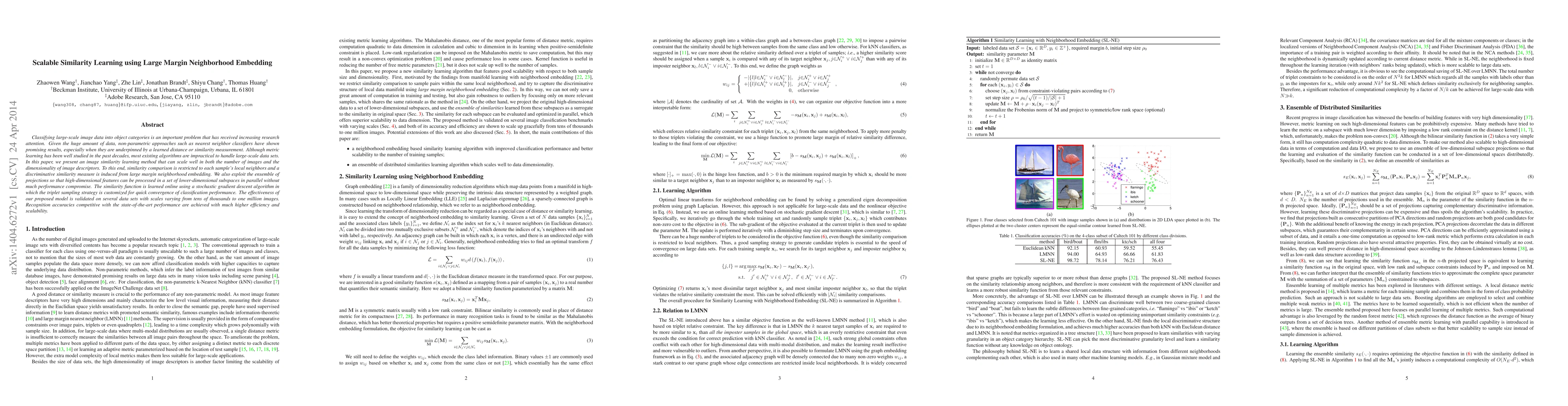 This paper proposes a scalable similarity learning method for large-scale image classification using large margin neighborhood embedding and ensemble projections. The method efficiently processes high-dimensional data through parallel lower-dimensional subspaces, achieving competitive recognition accuracy with improved efficiency and scalability.