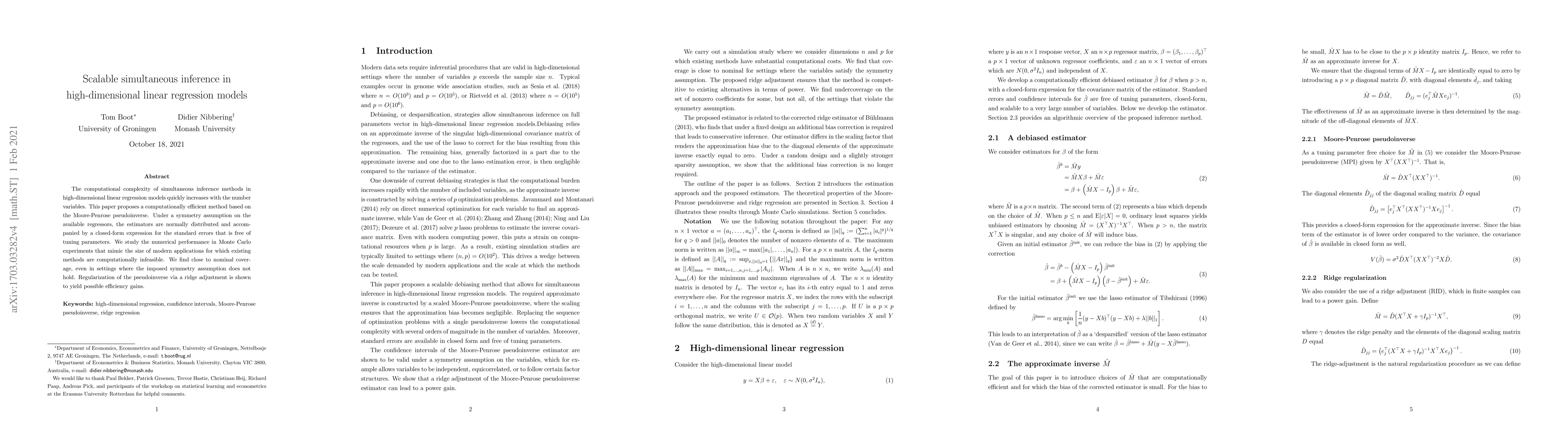 The computational complexity of simultaneous inference methods in high-dimensional linear regression models quickly increases with the number variables. This paper proposes a computationally efficient method based on the Moore-Penrose pseudoinverse. Under a symmetry assumption on the available regressors, the estimators are normally distributed and accompanied by a closed-form expression for the standard errors that is free of tuning parameters. We study the numerical performance in Monte Carlo experiments that mimic the size of modern applications for which existing methods are computationally infeasible. We find close to nominal coverage, even in settings where the imposed symmetry assumption does not hold. Regularization of the pseudoinverse via a ridge adjustment is shown to yield possible efficiency gains.