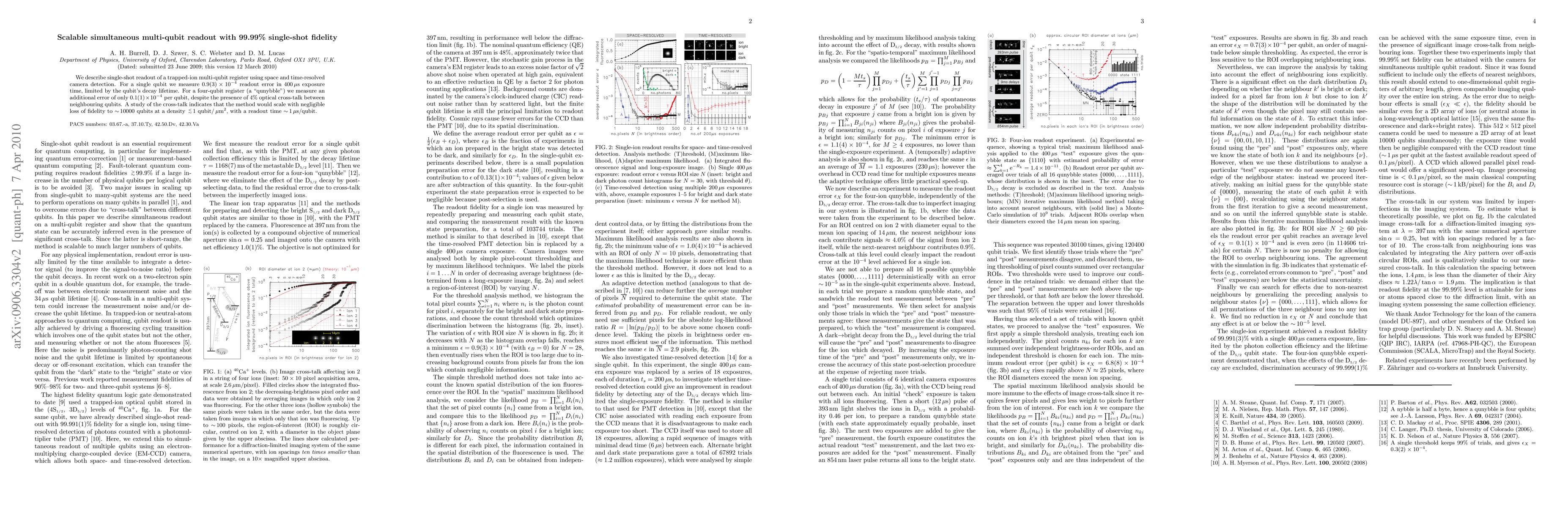 This paper presents a method for scalable simultaneous readout of trapped-ion multi-qubit registers, achieving 99.99% single-shot fidelity. The technique uses space and time-resolved camera detection, demonstrating a readout error of 0.9(3)x10^{-4} for individual qubits and only a marginal increase for a four-qubit register, despite 4% optical cross-talk.