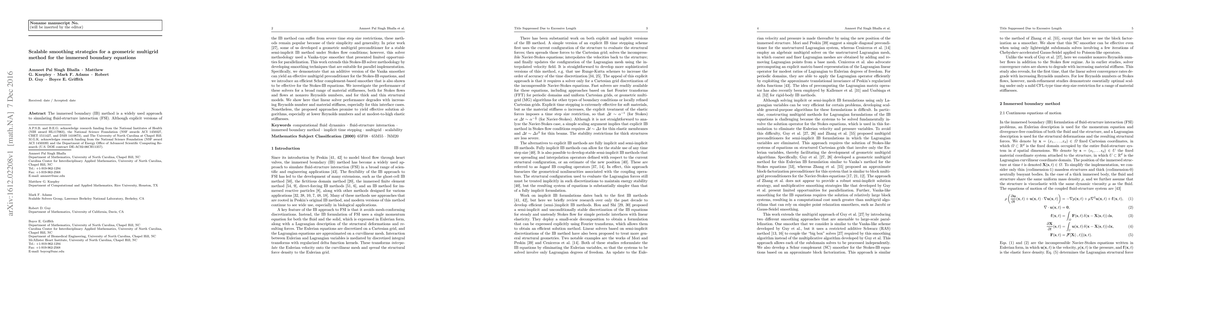 This paper develops scalable smoothing strategies for a geometric multigrid method applied to the immersed boundary equations, focusing on parallelizable smoothers for fluid-structure interaction simulations. The proposed additive Vanka smoother and Schur complement-based smoother show promise for efficient parallel implementation, particularly under Stokes flow conditions and moderate to high material stiffness.