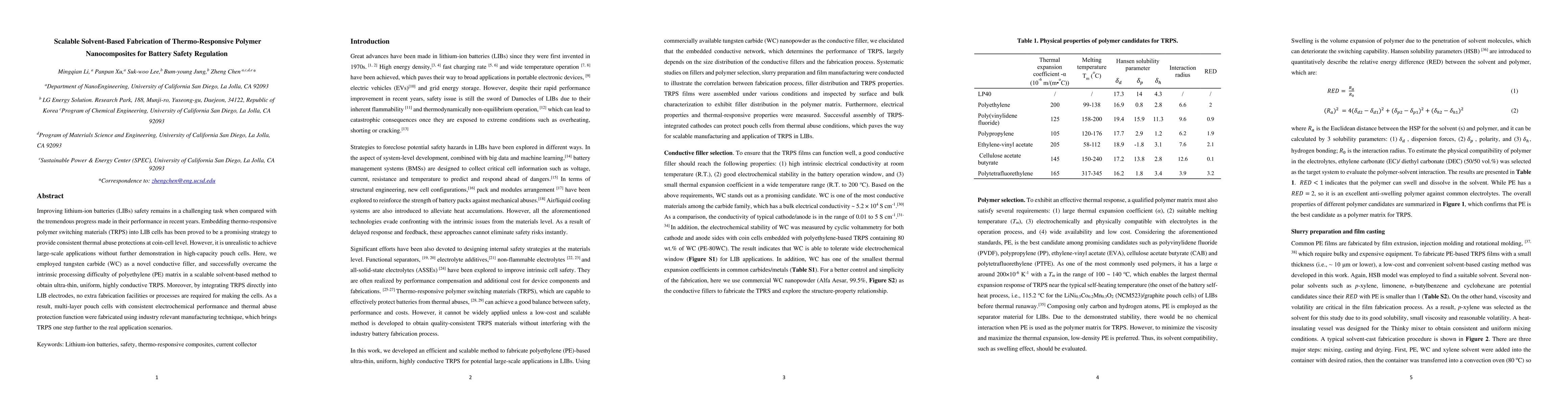 Improving lithium-ion batteries (LIBs) safety remains in a challenging task when compared with the tremendous progress made in their performance in recent years. Embedding thermo-responsive polymer switching materials (TRPS) into LIB cells has been proved to be a promising strategy to provide consistent thermal abuse protections at coin-cell level. However, it is unrealistic to achieve large-scale applications without further demonstration in high-capacity pouch cells. Here, we employed tungsten carbide (WC) as a novel conductive filler, and successfully overcame the intrinsic processing difficulty of polyethylene (PE) matrix in a scalable solvent-based method to obtain ultra-thin, uniform, highly conductive TRPS. Moreover, by integrating TRPS directly into LIB electrodes, no extra fabrication facilities or processes are required for making the cells. As a result, multi-layer pouch cells with consistent electrochemical performance and thermal abuse protection function were fabricated using industry relevant manufacturing techniques, which brings TRPS one step further to the real application scenarios.